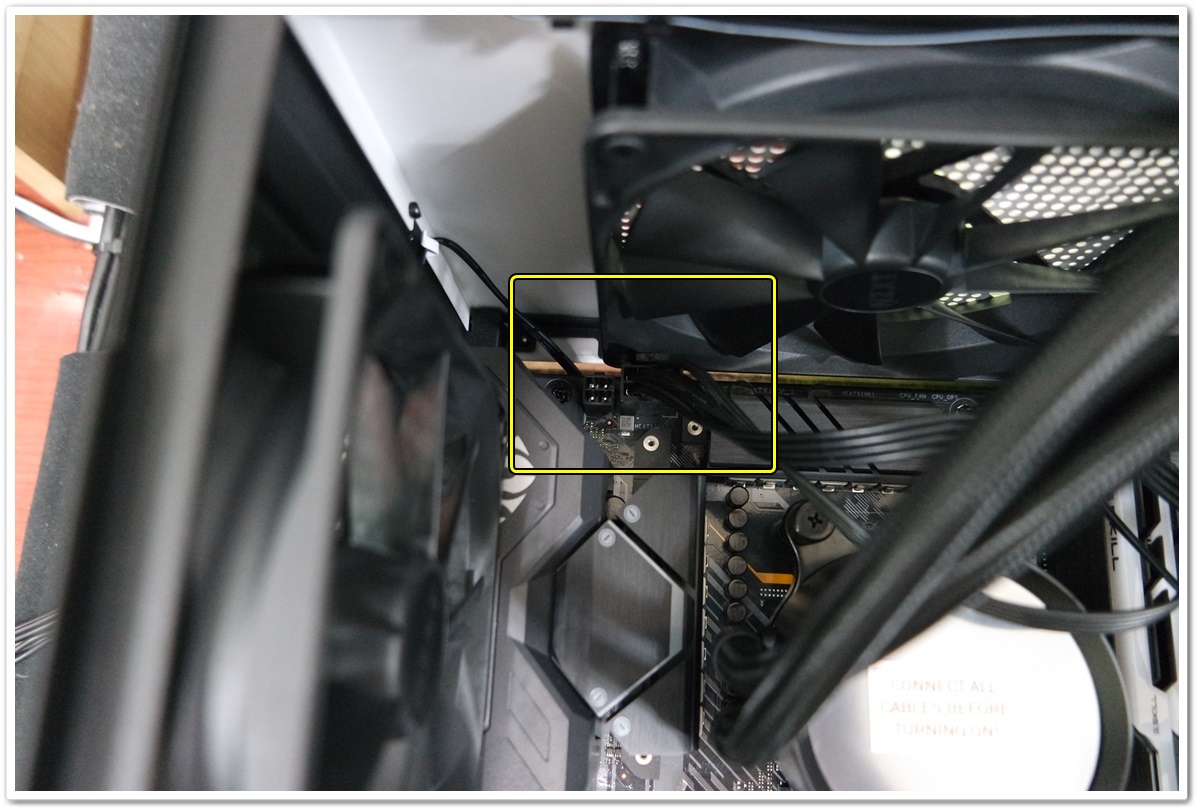 CPU 보조전원 케이블 8핀과 4핀 중에 4핀 전원 케이블이 연결이 안된 것을 확인했습니다. 공간이 좁아서 상당히 꽂기가 어려웠습니다. 상단팬을 분리하고 연결했습니다.