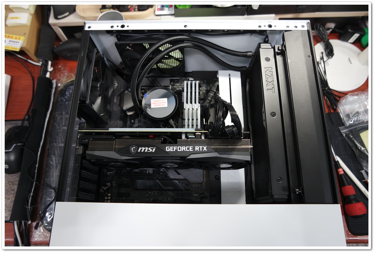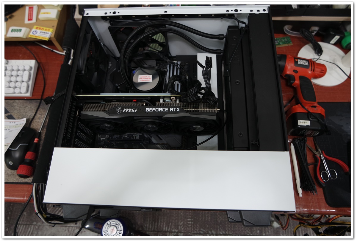 RTX3080 그래픽카드를 들어내고 내부의 조립 상태를 확인하고 있습니다.