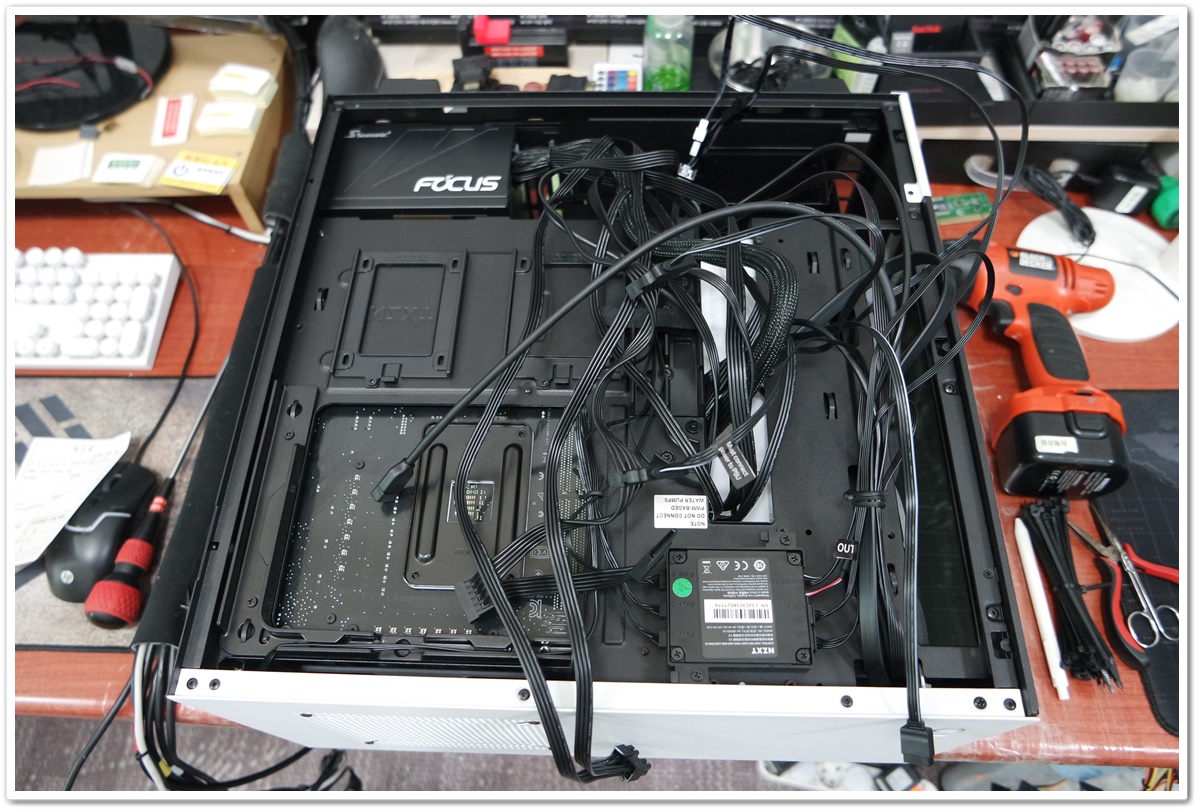 쿨러도 수랭쿨러를 장착해 오셨는데 연결할 케이블의 종류가 많고, 사용하지 않는 케이블도 있어서 매뉴얼을 찾아가면서 조립을 진행했습니다.