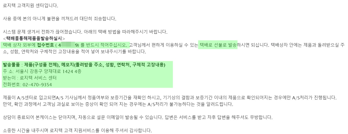 로지텍 서비스 센터 전화번호는 007-98601-8207 입니다. (수신자 부담)