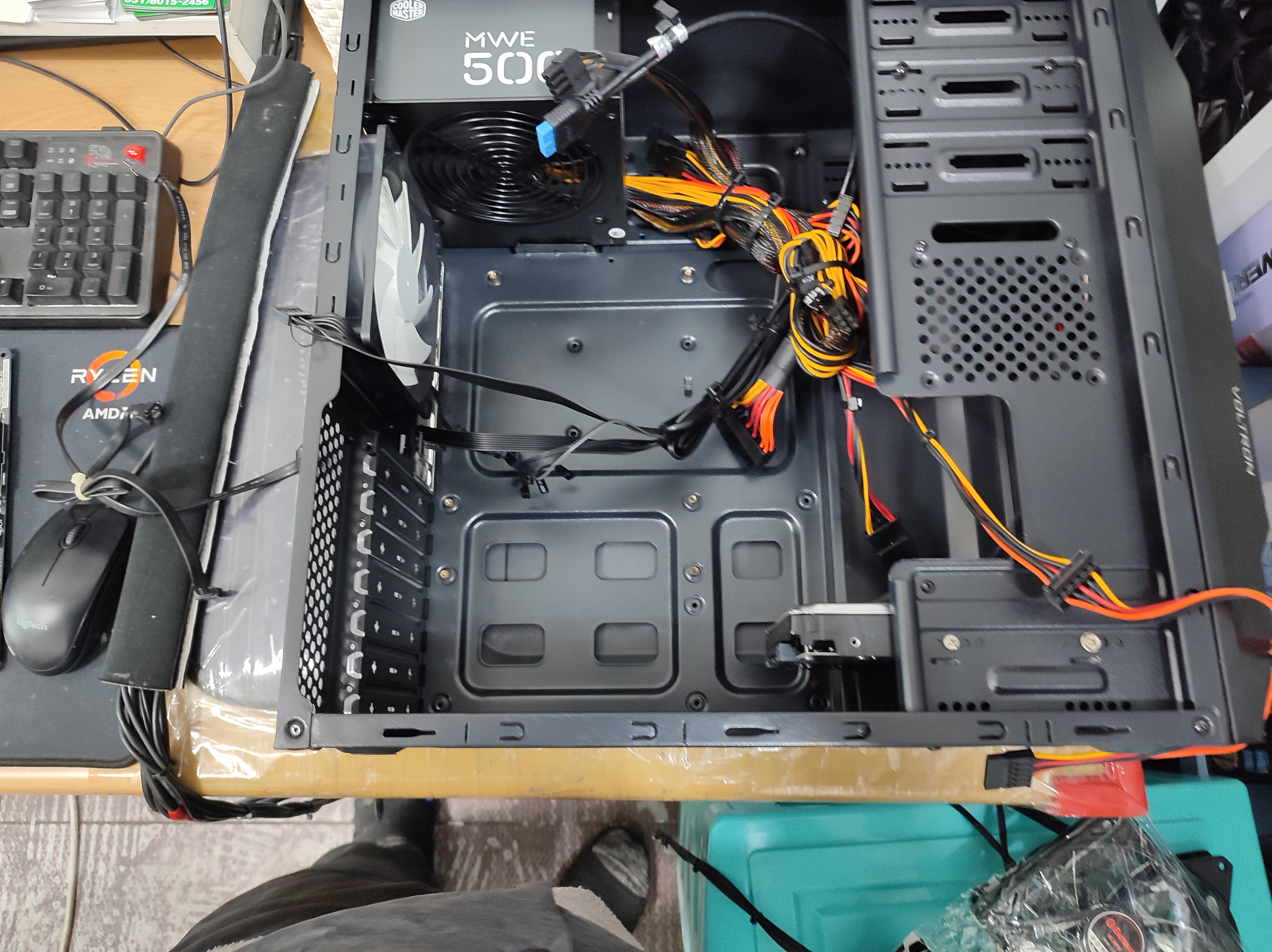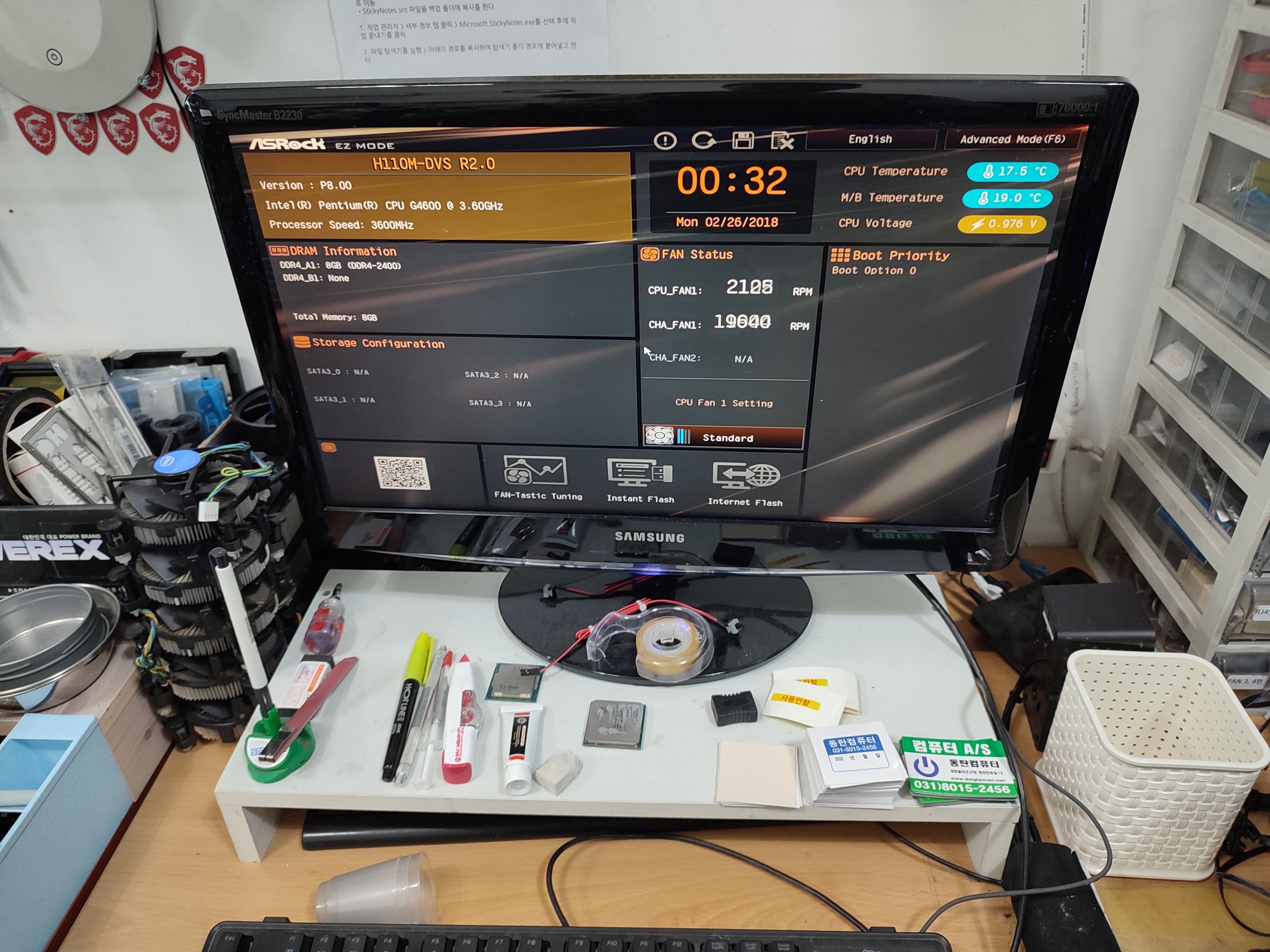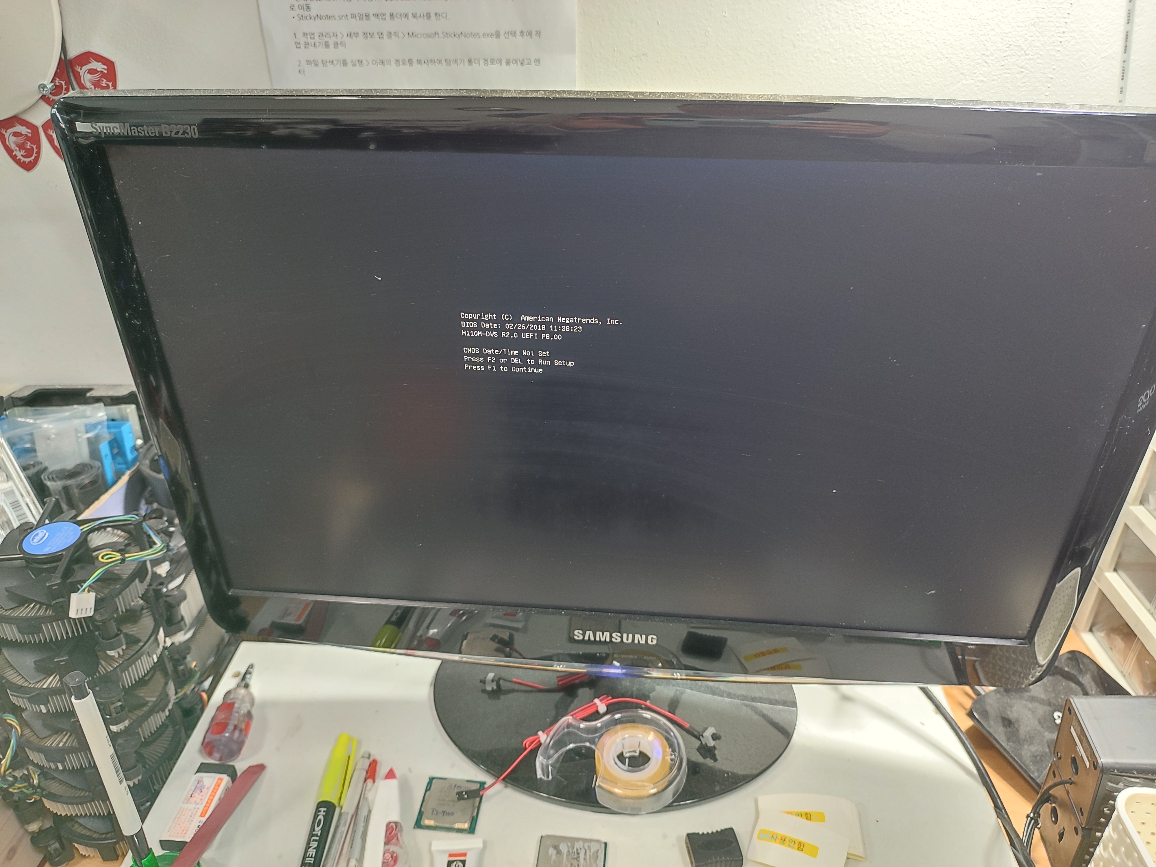 아래의 컴퓨터도 안 켜지는 증상(먹통)으로 입고된 컴퓨터인데요. 메인보드 불량으로 의심돼서 메인보드를 케이스에서 분리해서 테스트를 진행하고 있습니다. 외부로 분리하니깐 정상적으로 화면이 뜨네요.