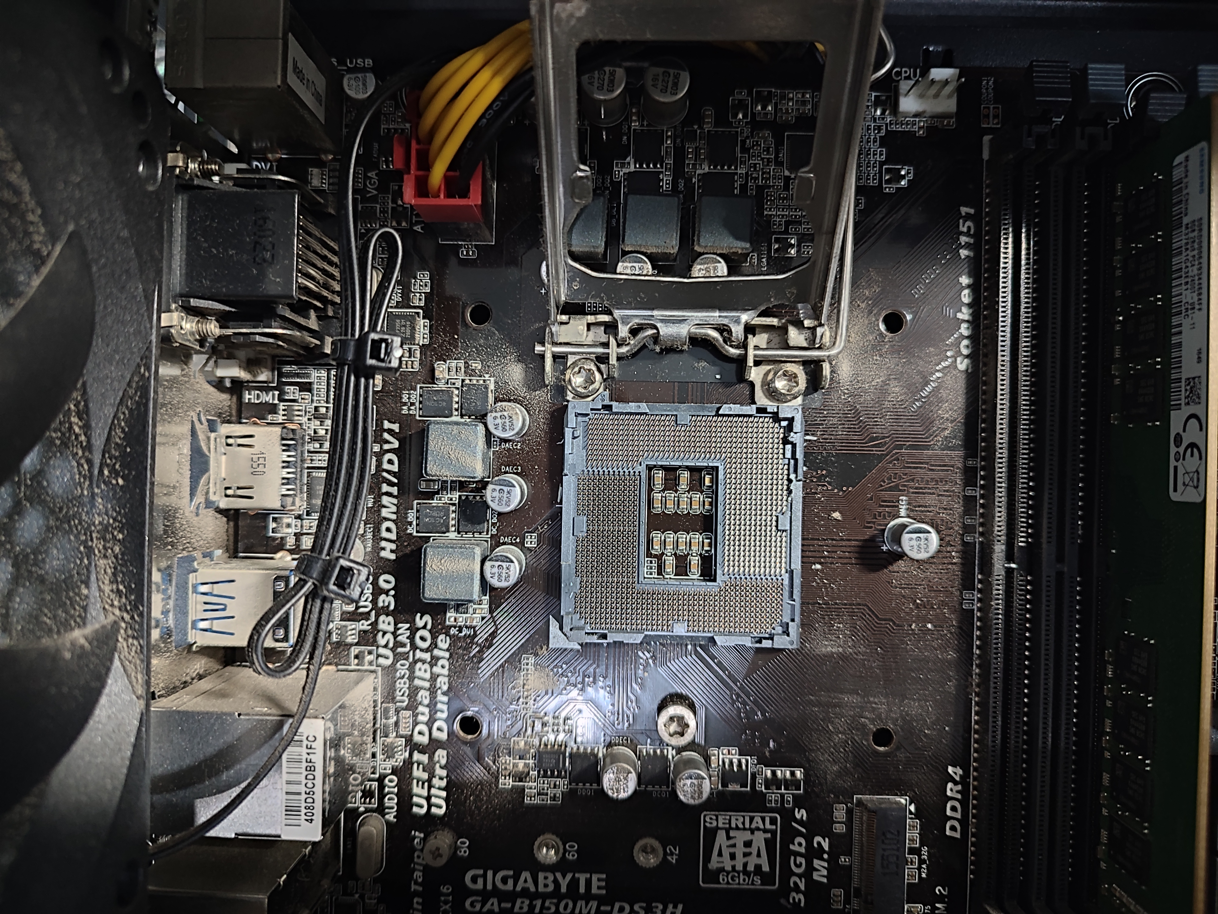 CPU 소켓의 상태도 확인해보고 외관상 탄 흔적이나 파손된 부속이 있는지 찾아봤지만 눈에 띄질 않네요. 메인보드의 자잘한 부속은 워낙 많기 때문에 모든 부속을 눈으로 확인하는 건 어렵고요. 눈으로 훑어볼 수 있는 부분만 빠르게 점검했습니다.