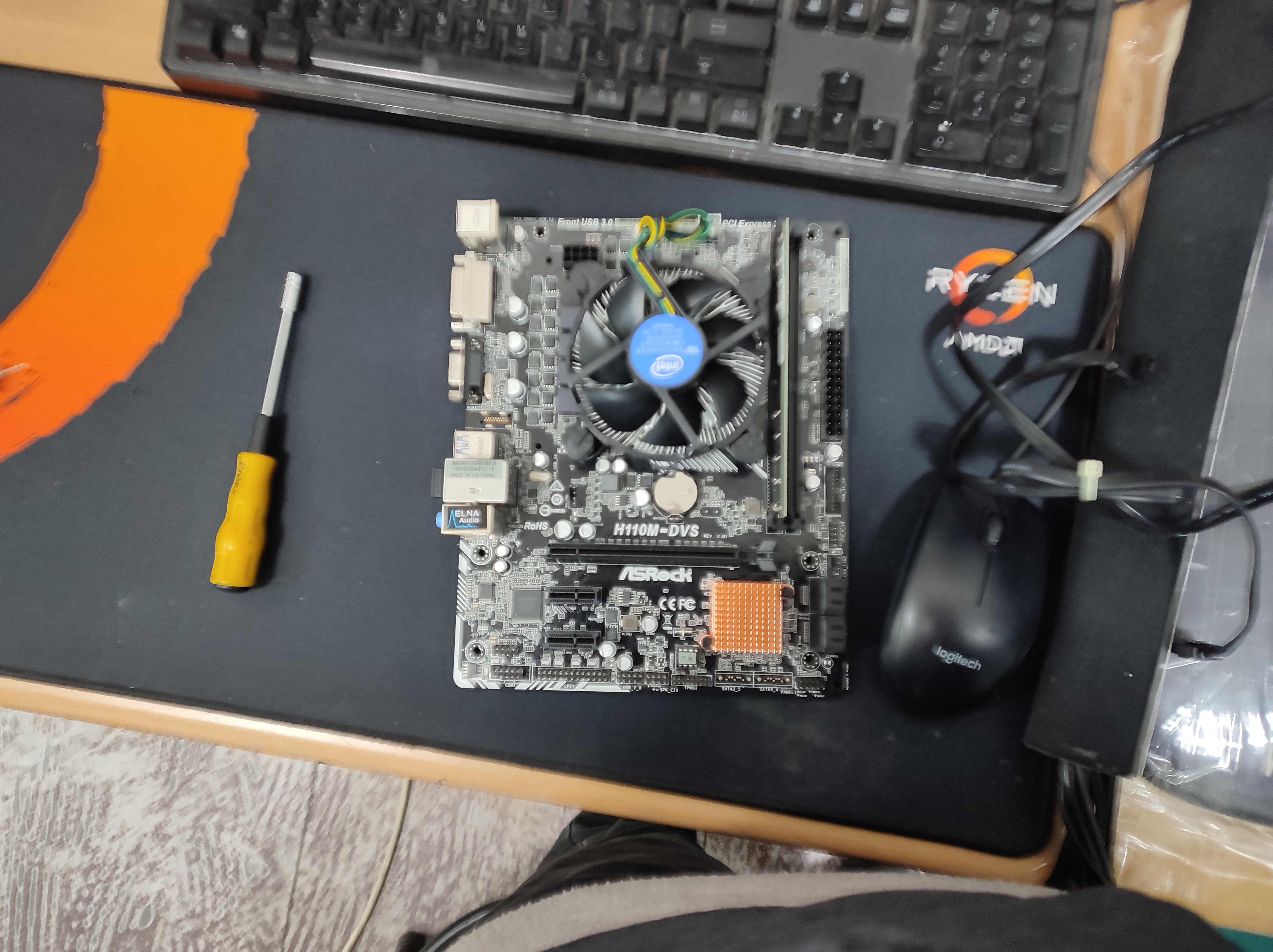 손님의 CPU는 내장 그래픽 칩셋이 없는 F버전의 CPU이기 때문에, 그래픽카드의 화면 출력을 먼저 확인하고 손님의 CPU를 메인보드에 꽂아서 테스트 진행합니다. 아래와 같이 손님 CPU, RAM, 그래픽카드 + 제 테스트 메인보드(H410칩셋)에서는 화면이 정상적으로 보이고 있습니다.