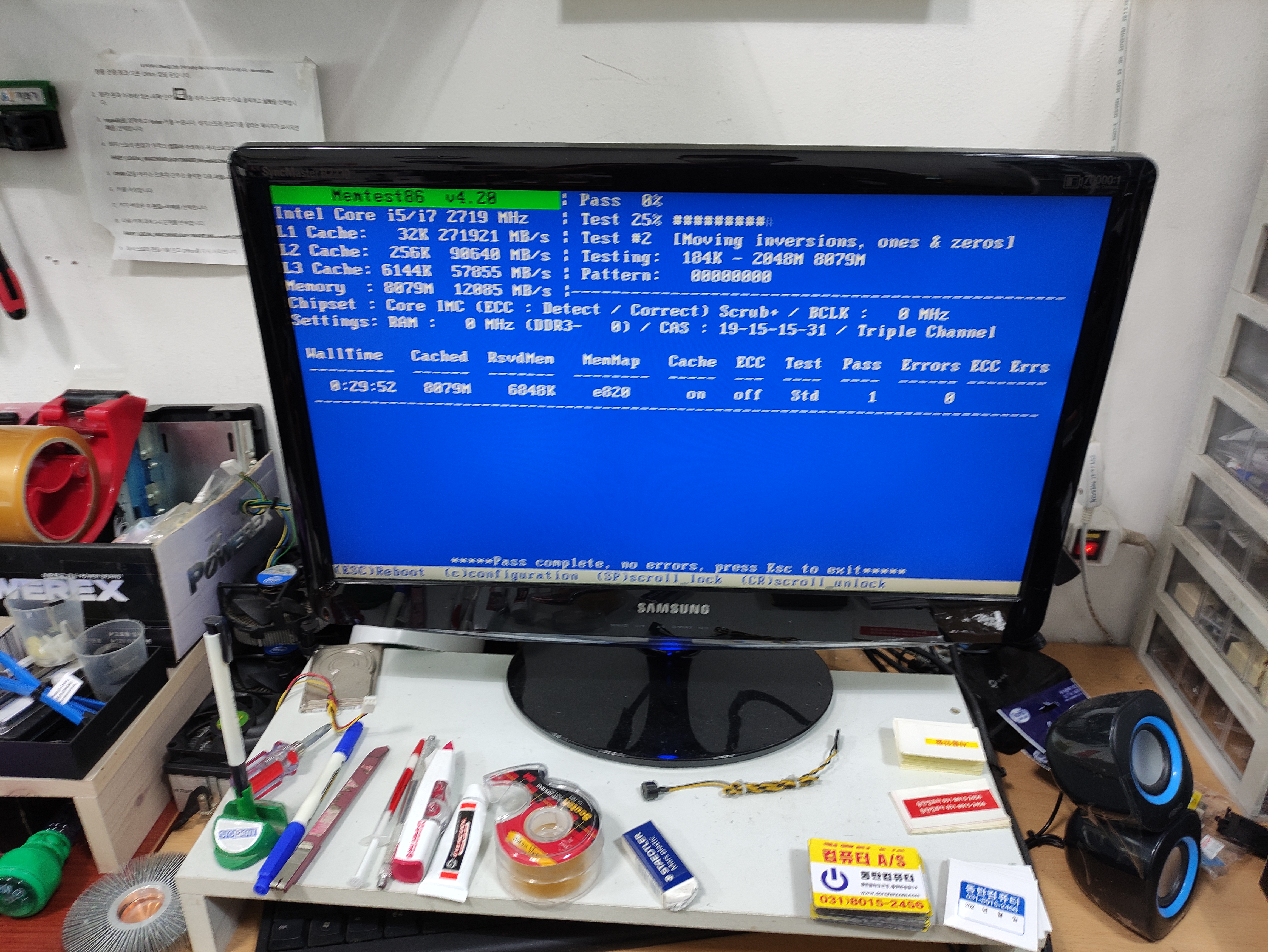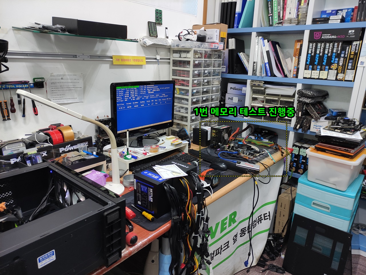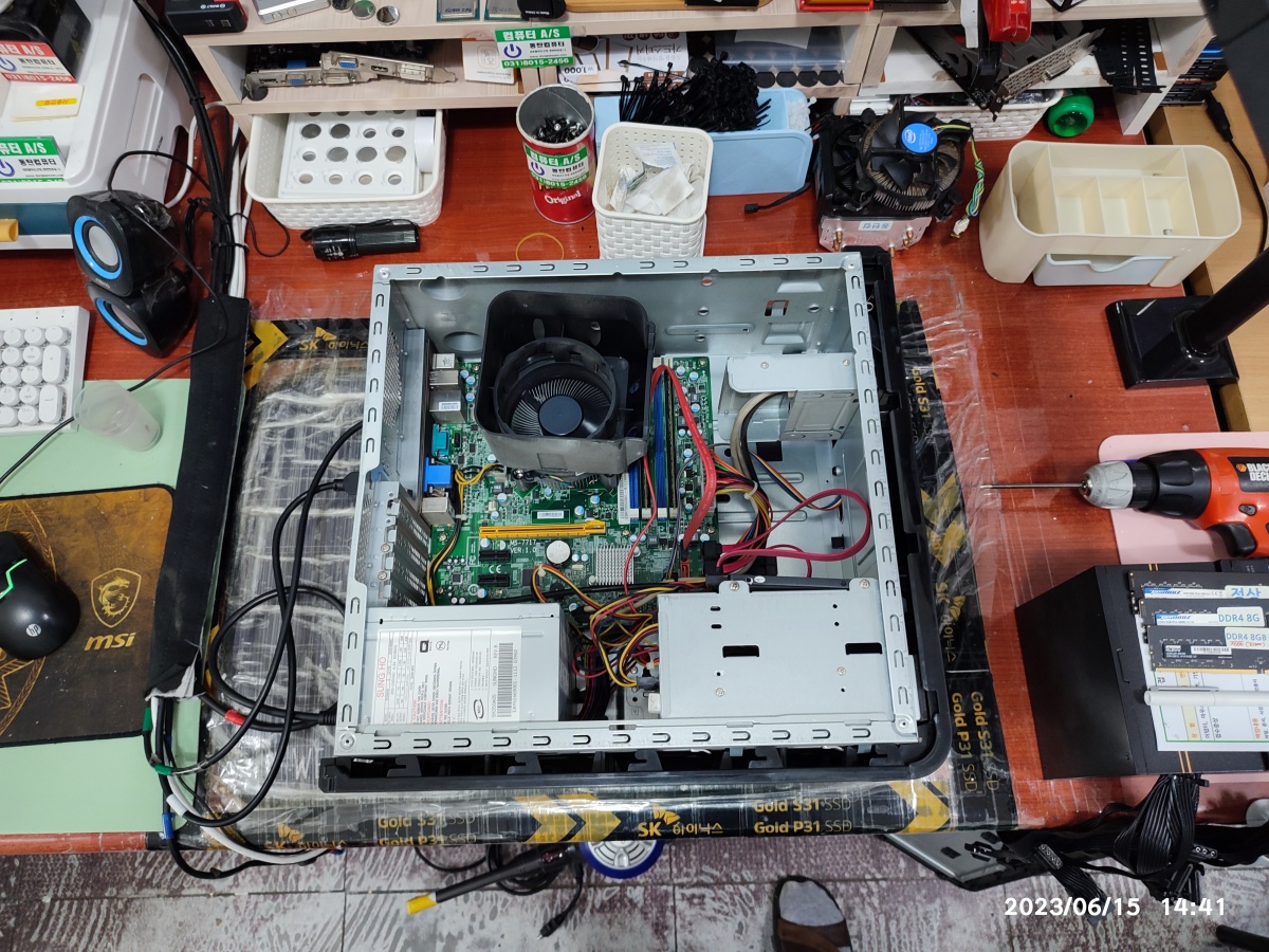 메모리테스트를 진행하는 동안 손님컴퓨터에는 삼성메모리 DDR4 8기가를 붙여서 테스트를 진행하고 있습니다. 사타케이블도 교체했고요. 메인보드 시모스 배터리도 3~년 정도 사용했기 때문에 교체했습니다.