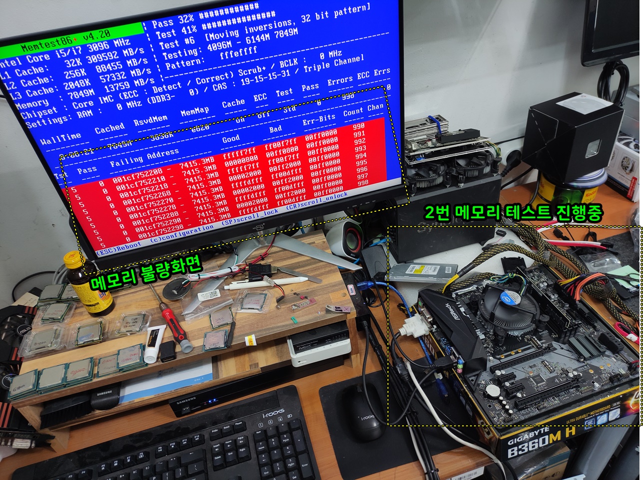 컴퓨터의 메모리 불량이 의심돼서 메모리 2개를 다른 컴퓨터에 연결해서 테스트를 진행했습니다.