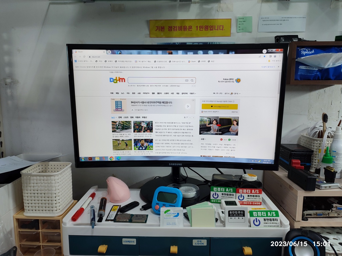 제 메모리로 정상 부팅되는 화면을 확인한 다음 손님의 메모리 2개를 모두 세척하고 재장착했습니다. 정상적으로 인터넷에 접속되는 모습을 확인한 다음 출고했습니다. 윈도우7을 사용하고 계신데, 일부 프로그램이 윈도 7에서 동작되지 않을 수 있어서 윈도 10 업그레이드를 권해드렸습니다.