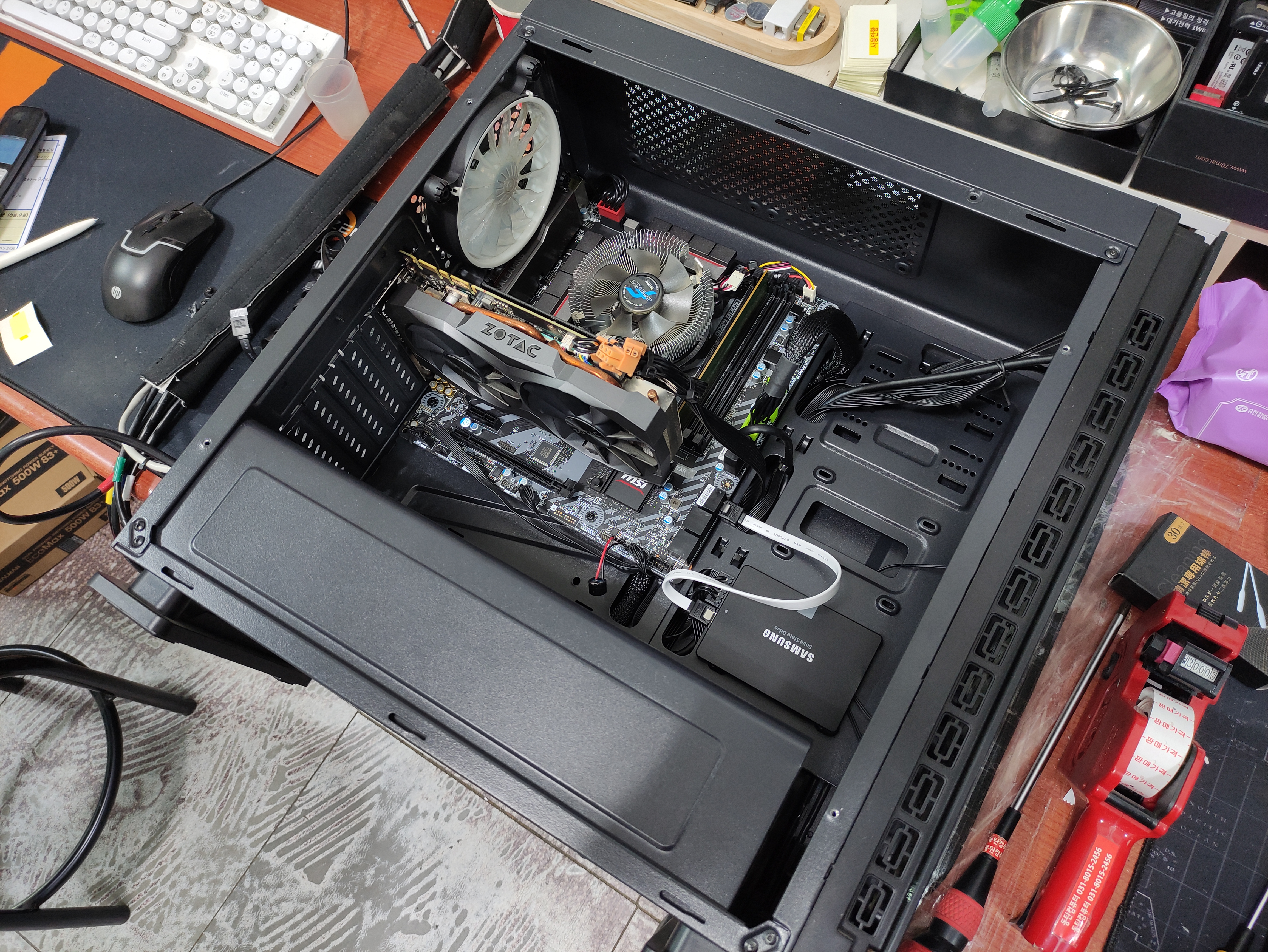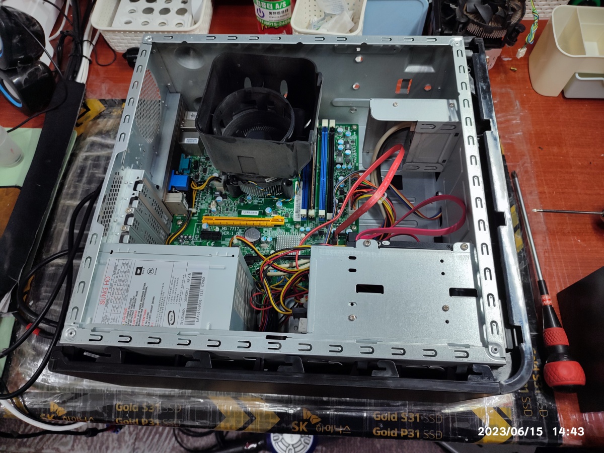 가만히 사용하다가 갑자기 꺼지고 안 켜지는 증상이 있어서 찾아주신 손님의 컴퓨터입니다. 일단은 먼지가 굉장히 많은 상태라서, 전원을 넣기 전에 먼지부터 제거했습니다. (먼지 때문에 고장 난 건 아니에요. 컴퓨터 케이스 열고 틀면 먼지가 실내에서 날릴 거 같아서 먼저 털고 시작했습니다. 근데, 보통은 먼지가 선풍기 날개에 굳은 먼지처럼, 이미 고착된 상태라서, 이 상태 그대로 동작시켜도 쉽게 날아가진 않습니다. 외부 공기 압력 = 컴프레셔 에어로 불어주면 잘 날아갑니다.)