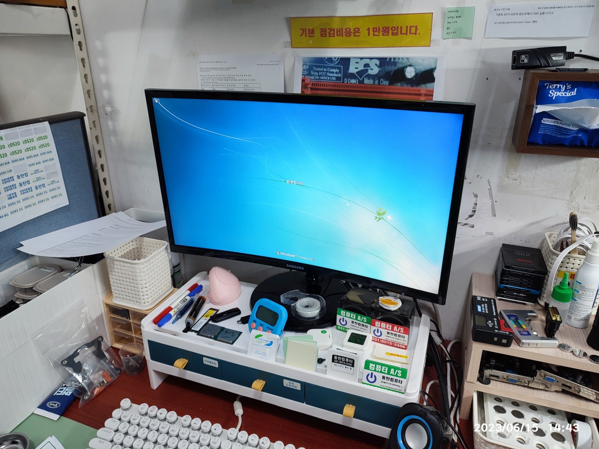 제 메모리로 정상 부팅되는 화면을 확인한 다음 손님의 메모리 2개를 모두 세척하고 재장착했습니다. 정상적으로 인터넷에 접속되는 모습을 확인한 다음 출고했습니다. 윈도우7을 사용하고 계신데, 일부 프로그램이 윈도 7에서 동작되지 않을 수 있어서 윈도 10 업그레이드를 권해드렸습니다.