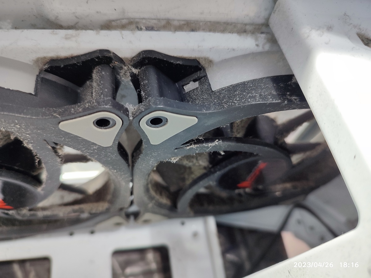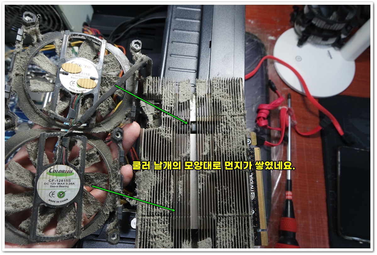 팬에도 먼지가 많이 쌓인 상태이고 방열판에도 먼지가 많이 낀 상태입니다. CPU 처럼 완전히 막을 생성하지는 못했지만, 팬의 회전 방향에 따라서 먼지가 쌓인 상태입니다. 무한대 또는 8 자 형태로 먼지가 쌓였네요. 2개의 팬이 만나는 가운데 부분에는 상대적으로 먼지가 많이 쌓이지 않은 것은 신기하네요. (팬의 모터와 가이드 부분은 다른 부분보다 먼지가 적게 쌓였네요.)