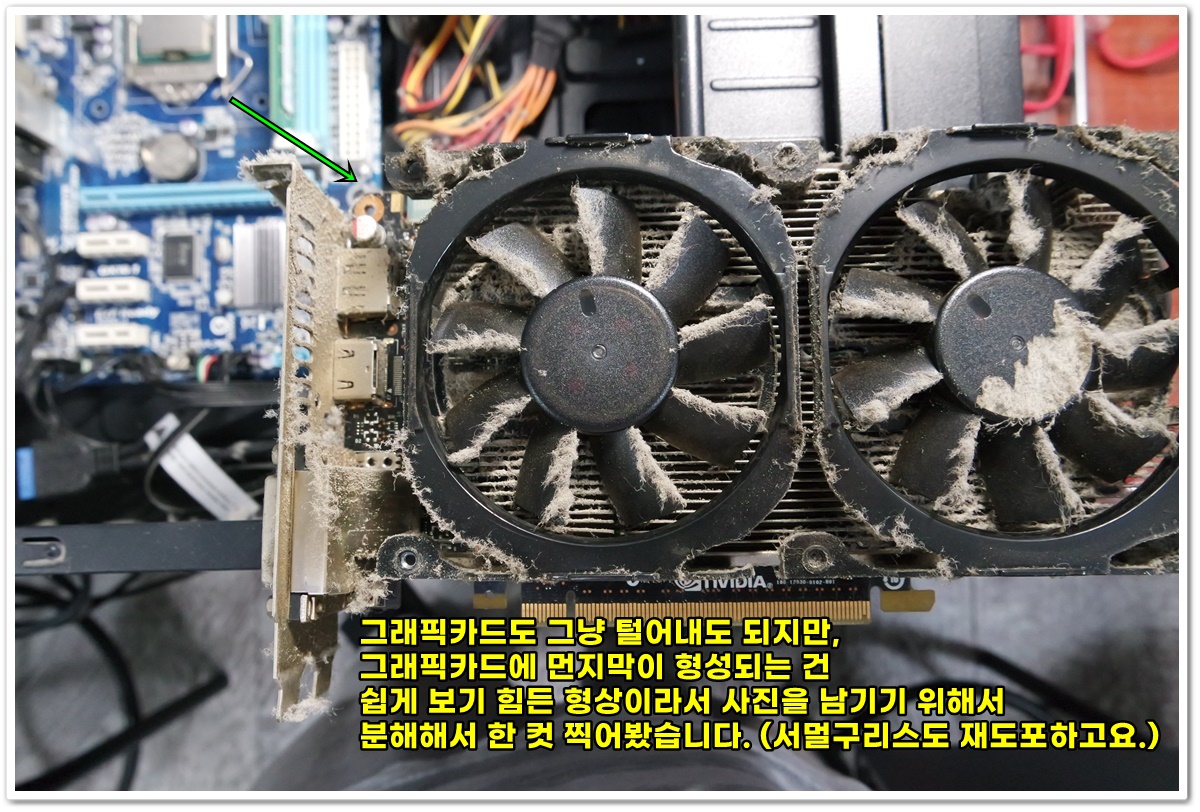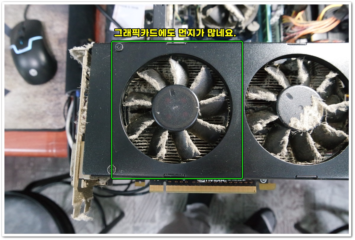 심지어 그래픽카드 고정하는 나사 위에도 먼지가 쌓여서 나사 구멍 찾기가 쉽지 않았네요.