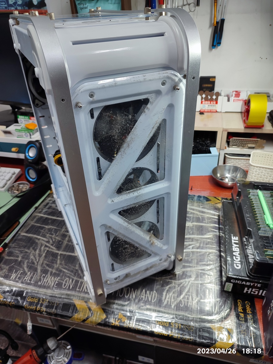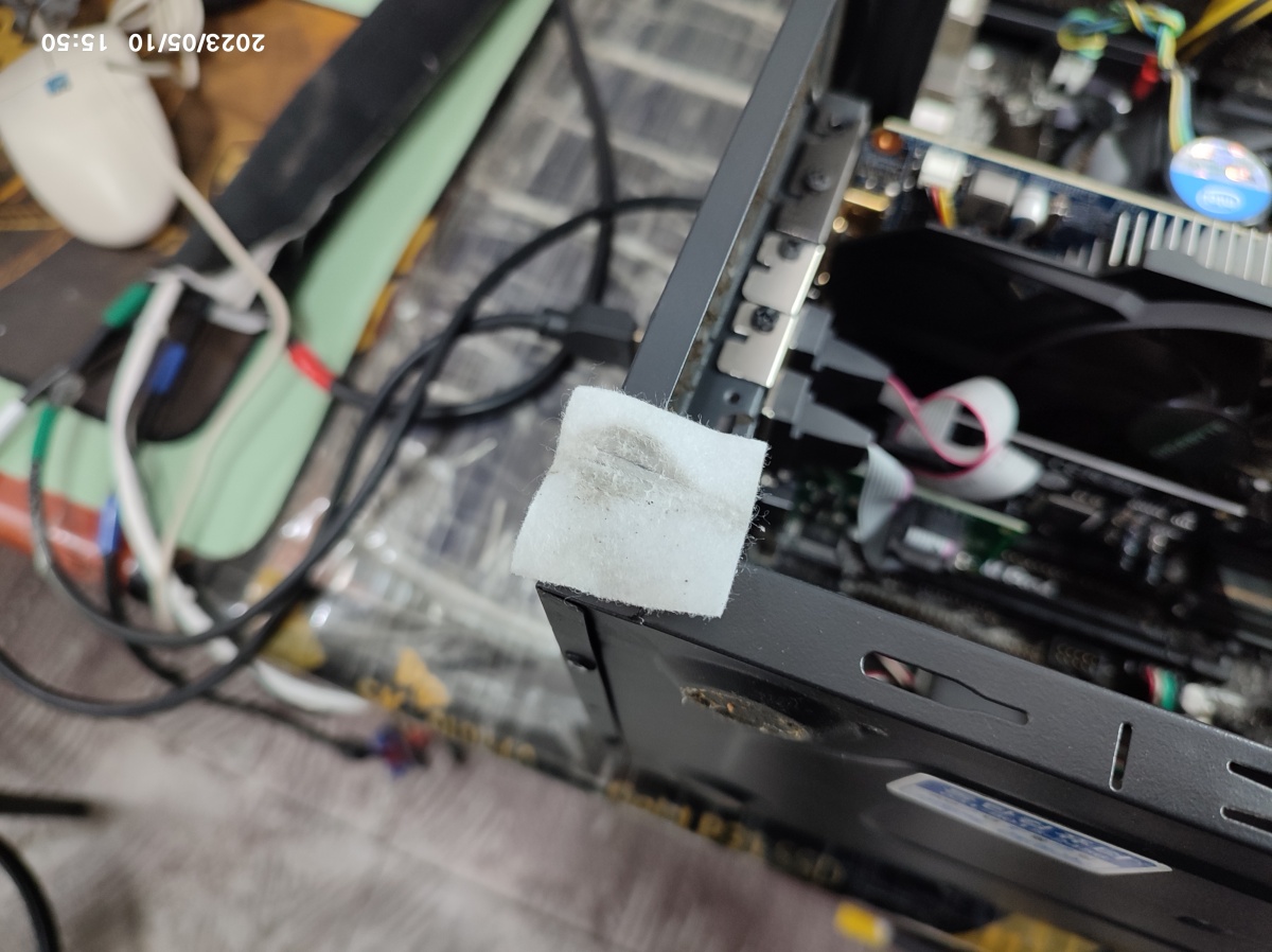 [2023년 05월 09일] 입고된 컴퓨터입니다. 청소 요청은 아니고 윈도우 부팅이 잘 안되는 컴퓨터입니다. 먼지가 담배 연기와 붙어서 컴프레셔의 공기 압으로는 먼지가 떨어지지 않는 상태입니다. 먼지를 물티슈로 일일이 닦아드리진 않고 출고했습니다. 단, 메모리와 그래픽카드는 골드핑거에 묻은 (담배 연기과 먼지 등)오염물은 알코올 솜으로 닦았습니다. 물티슈보다는 알코올 스왑이 빨리 증발되며, 기름 성분이 깨끗하게 잘 닦입니다.
