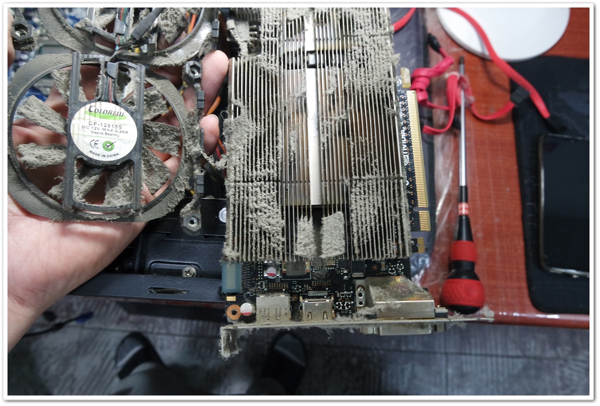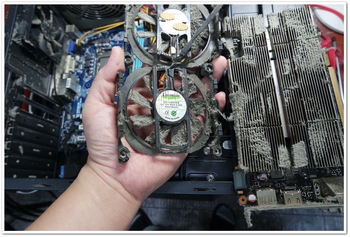 그래픽카드 덮개를 제거한 속 모습입니다. 먼지가 참 많이 끼였네요.