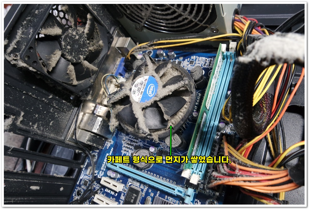 병점에서 방문해 주신 병점 손님의 컴퓨터입니다. 컴퓨터의 먼지가 굉장히 많이 쌓인 상태라서 사진을 한 번 남겨봤습니다. 먼지를 털어내기전에 먼지가 쌓인 형태를 자세히 보여드리기 위함도 있습니다.