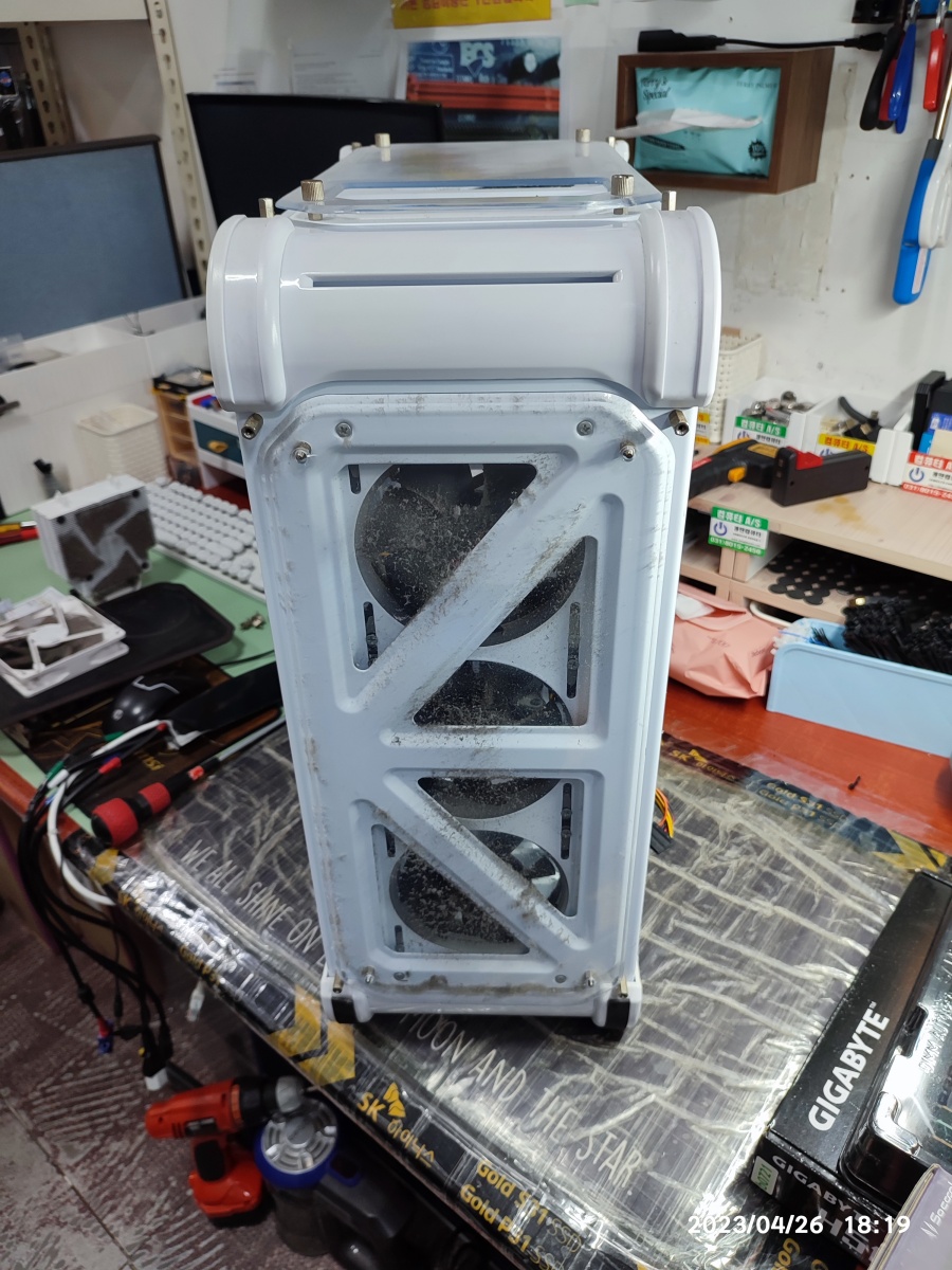 케이스 하단에 장착된 팬인데요. 팬 밑에 먼지가 쌓여서, 털리지도 않고 분해해야 닦을 수가 있는데요. 나사 구멍의 상태가 좋지 않아서 나사가 3개 밖에 조여지질 않네요. 작업 공간이 협소하다 보니, 손을 넣어서 나사 분해/조립하기가 쉽지는 않습니다. 전면팬도 물티슈로 날개 한 개씩 닦아야 하는데, 도 닦는 느낌으로 날개 하나씩 닦았습니다.