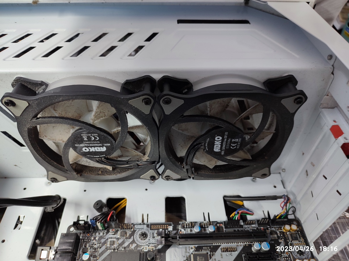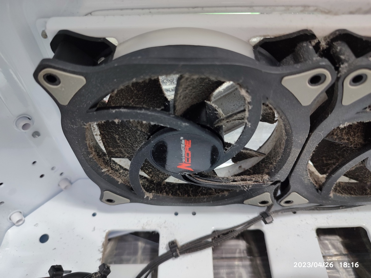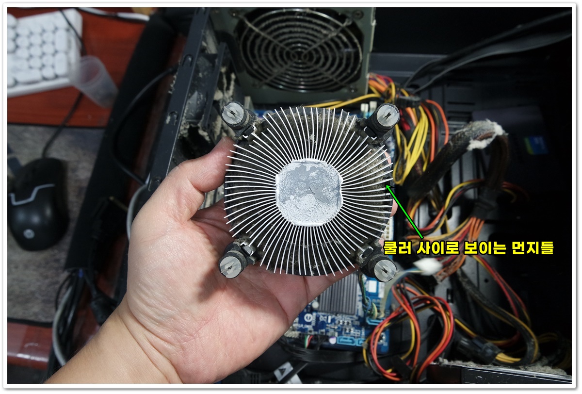 쿨러 사이로 먼지막의 형태가 보입니다. 바람이 통과할 수 있는 부분은 거의 막아놓은 듯 보입니다. 과열도 과열이지만 평소에 팬소음이 많이 났다고 하네요.