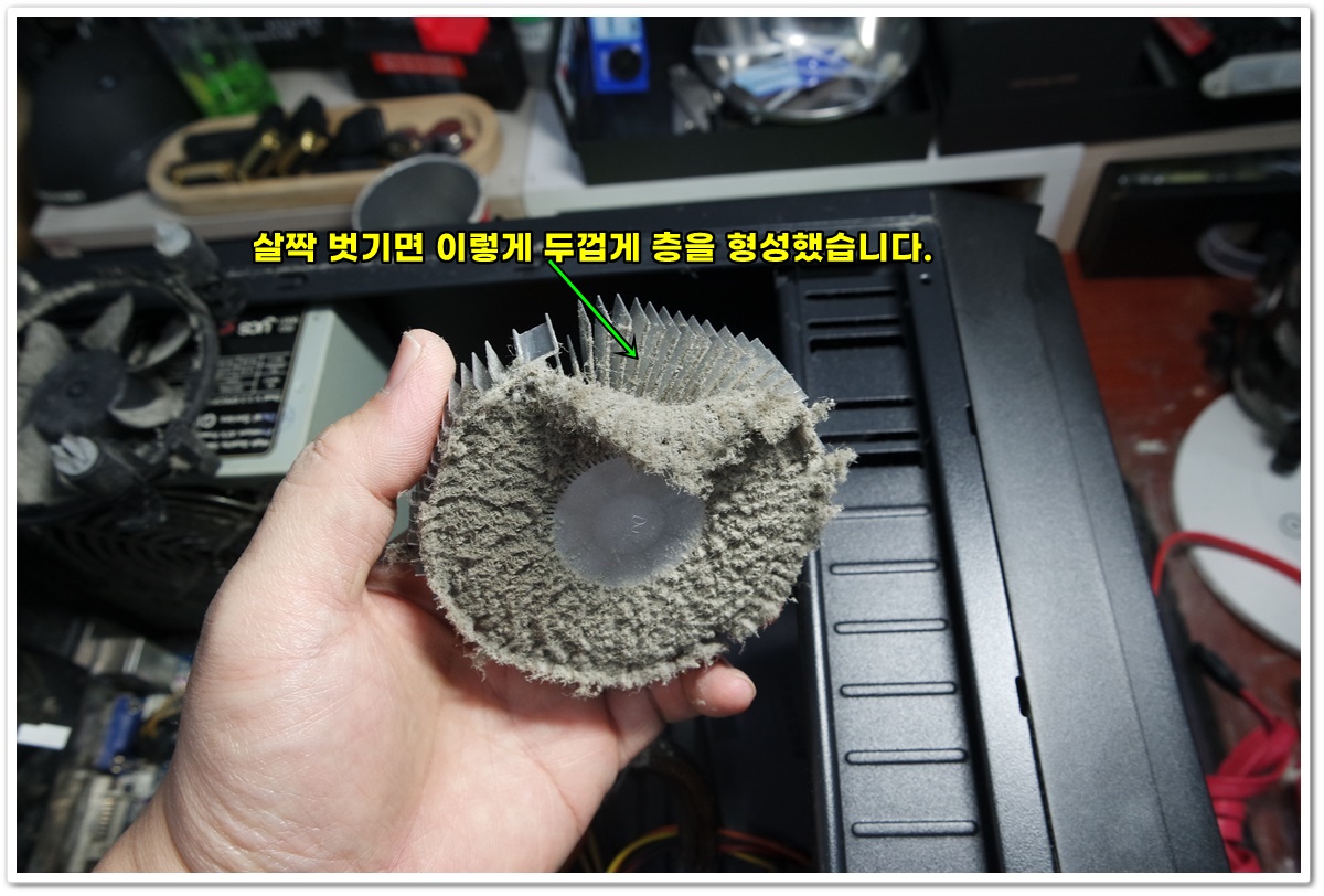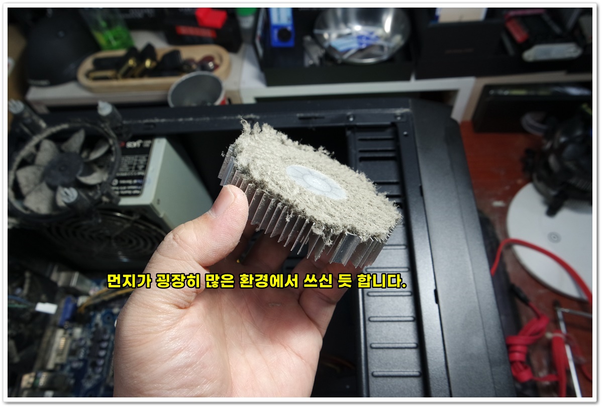 특히 CPU 쿨러 위에 먼지가 굉장히 많이 쌓인 형태입니다. 보통은 그래픽카드보다는 CPU 쪽 방열판에 먼지가 굉장히 많이 쌓이는 거 같습니다. 아무래도 CPU 팬이 고속회전하는 경우가 많고 지면과 수직으로 장착해서 사용하는 경우가 많다 보니깐 방열판 위로 먼지가 잘 쌓이는 거 같습니다.