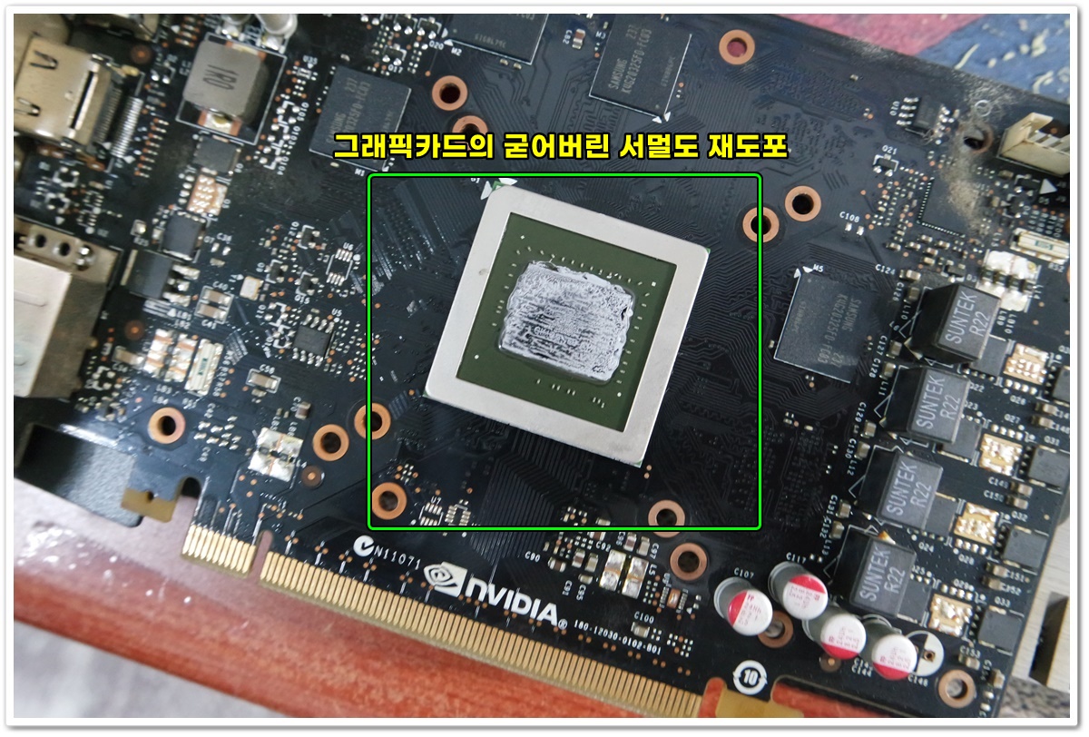 여기까지 뜯었으니 그래픽카드 서멀구리스 재도포 작업도 진행했습니다. (고가의 그래픽카드 서멀구리스 재도포 작업을 의뢰 받지는 않습니다. 서멀구리스는 판매합니다. 직접 작업 권장드립니다.)