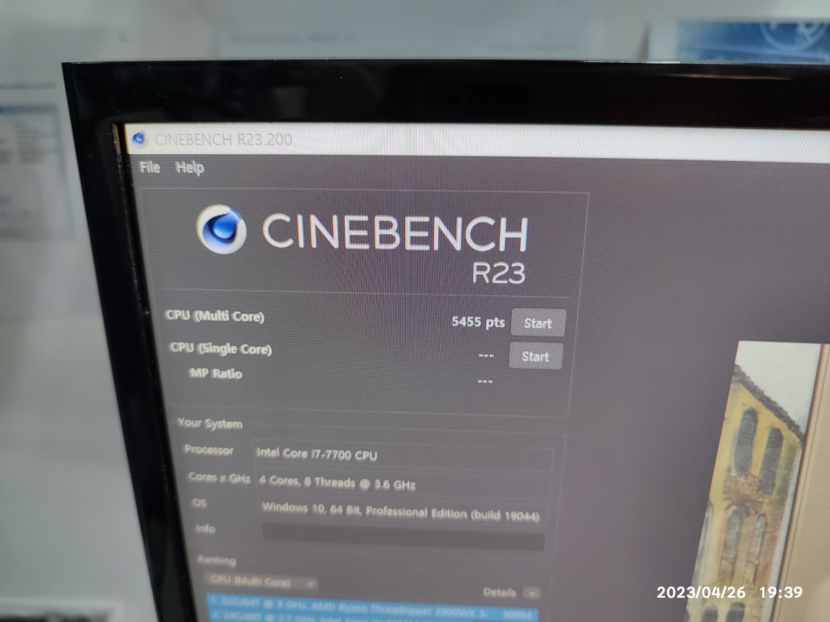 CPU 장착이 제대로 됐는지 확인차 씨네벤치 R23을 돌려서 CPU 온도를 확인해보고 있습니다. i7 7700 최대 온도가 55도 정도로 아주 좋은 (낮은) 온도가 형성되고 있네요.