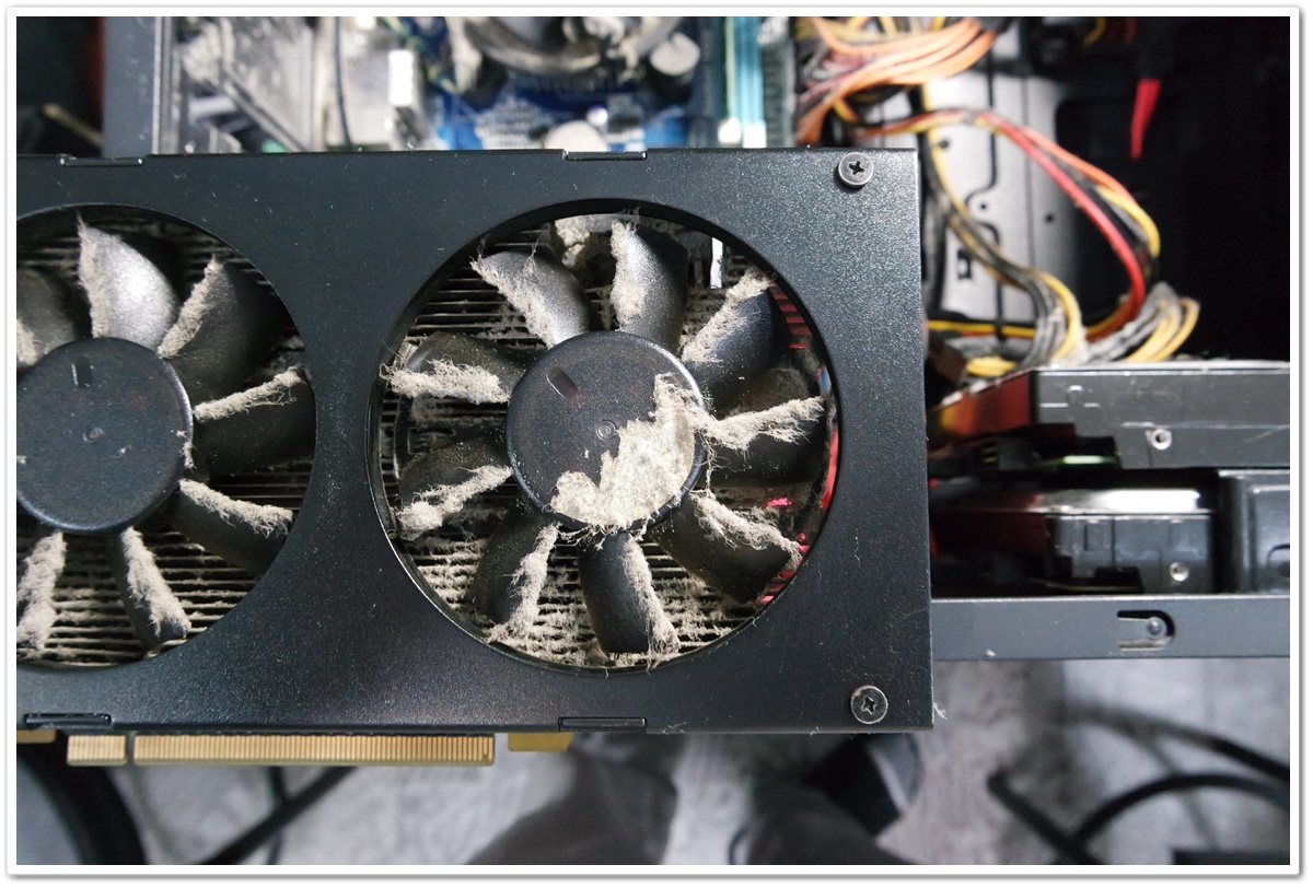 그래픽카드 덮개를 제거한 속 모습입니다. 먼지가 참 많이 끼였네요.
