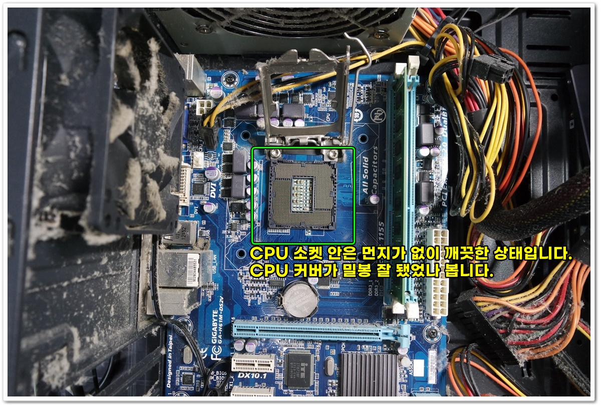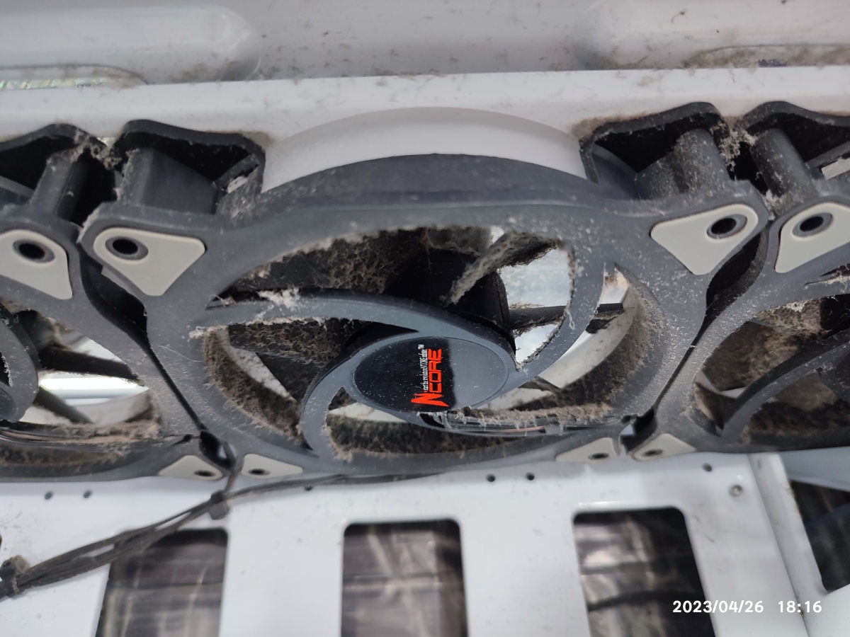 쿨러 사이로 먼지막의 형태가 보입니다. 바람이 통과할 수 있는 부분은 거의 막아놓은 듯 보입니다. 과열도 과열이지만 평소에 팬소음이 많이 났다고 하네요.
