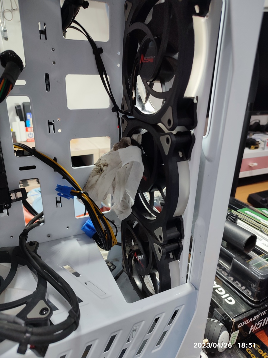 케이스 하단에 장착된 팬인데요. 팬 밑에 먼지가 쌓여서, 털리지도 않고 분해해야 닦을 수가 있는데요. 나사 구멍의 상태가 좋지 않아서 나사가 3개 밖에 조여지질 않네요. 작업 공간이 협소하다 보니, 손을 넣어서 나사 분해/조립하기가 쉽지는 않습니다. 전면팬도 물티슈로 날개 한 개씩 닦아야 하는데, 도 닦는 느낌으로 날개 하나씩 닦았습니다.
