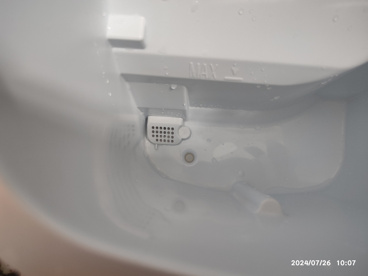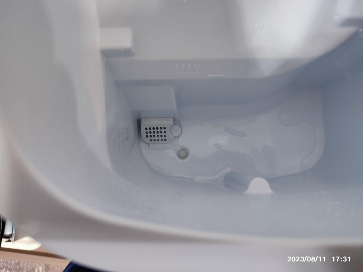 물통의 물을 제거하는 방법은 아래의 고무마개를 당겨서 제거하면 됩니다. 처음에는 방법을 몰라서 제거하기가 조금 힘들긴 했습니다. 끝 부분을 조금씩 당겨서 뽑았습니다. 싱크대에서 물을 뺐습니다. 물이 다 빠지면 다시 고무마개를 막았습니다. 물통 좌측 밑에 고무마개의 끝 부분이 보이네요. 그 뒤에 있는 망이 있는 부분이 물을 빨아 당기는 부분인 듯합니다. 이물질을 거를 수 있도록 거름망이 설치된 상태네요.
