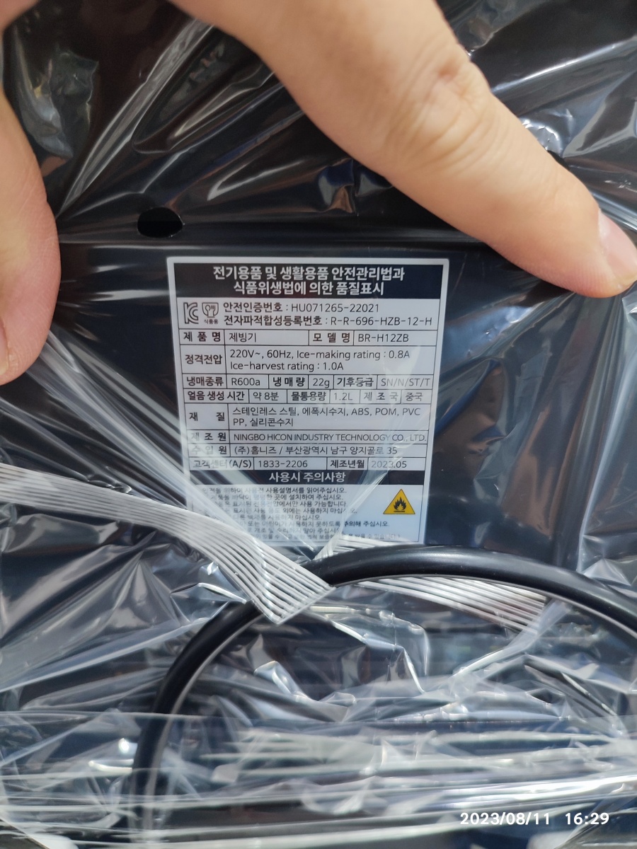220V 제품이고 Ice-making rating(제빙 등급) : 0.8A, Ice-harvest rating (얼음 수확 등급) : 1.0A 전기를 사용한다고 나오네요. 나중에 측정해 보니깐 80~120W 정도 사용되더라고요. 냉매 종류는 R600a, 냉매량 22g, 얼음 생성 시간은 약 8분, 물통 용량은 1.2L입니다. 스테인리스 스틸, 에폭시 수지, ABS, POM, PVC PP, 실리콘 수지, 제조원 NINGBO HICON INdustry TECHNOLOGY CO,. LTD., 수입원 : 홈니즈 / 부산광역시 남구 양지골로 35, 고객센터 1833-2206, 제조년월 2023년 05월