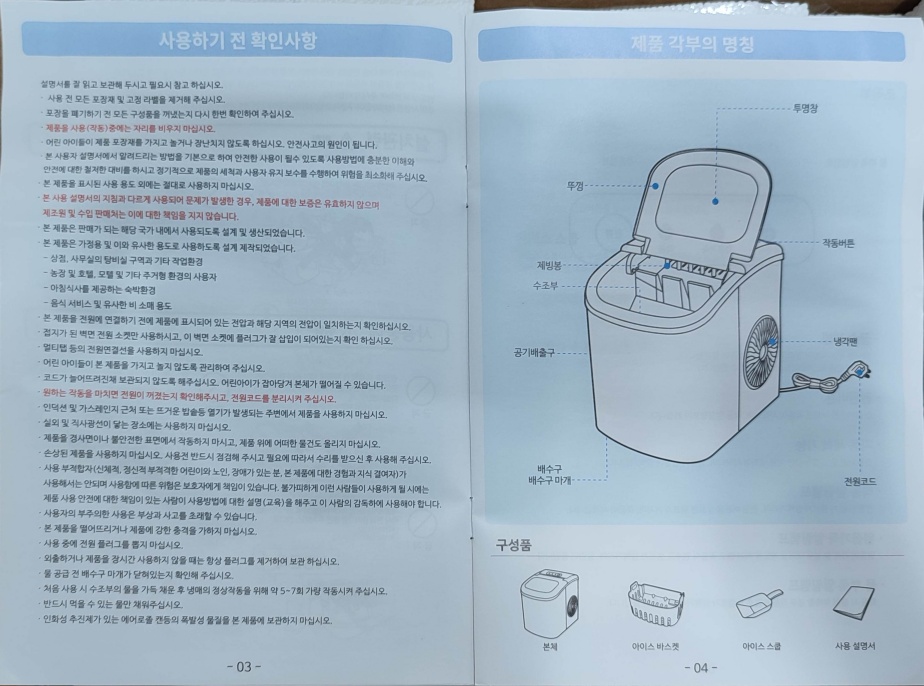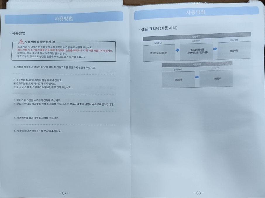 얼음 스푼이랑 얼음 바구니만 분리됩니다. 본체는 물 세척(세제)이 안 되고 자동 세척 기능으로 세척했습니다.