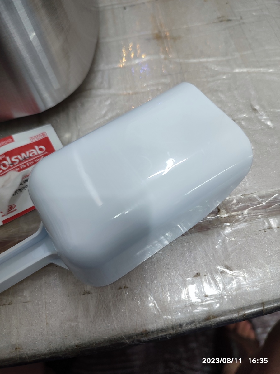 내부의 모습입니다. 테이프로 고정해 둔 상태인데요. 테이프를 뜯어야 합니다. 테이프가 조금 강력한 테이프라서 처음에 자국이 남더라고요. 알코올 스왑으로 닦아내고 분리되는 통이랑 아이스 스푼은 싱크대에서 별도로 세제 세척했습니다.