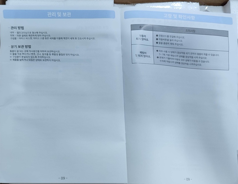 제품을 구입하고 처음으로 만들어진 얼음입니다. 첫 동작이라서 아직은 얼음이 제대로 형성되지 못한 모습입니다. 얼음이 이상하게 얼어서 조금 실망을 했습니다만 기다리니깐 제대로 된 얼음이 나오네요. 그리고 냉장고 등을 이동하고 바로 전원을 연결하면 기능이 제대로 동작되지 않는 걸로 알고 있습니다. 제빙기도 배송 온 상태에서 바로 동작시키면 문제가 있을 거 같네요. 내부 청소도 하시고 세척도 하시고 평평한 바닥에 제품이 제대로 자리 잡고 20~30분은 가만히 놔둔 상태로 동작시켜야 제대로 동작될 듯합니다.
