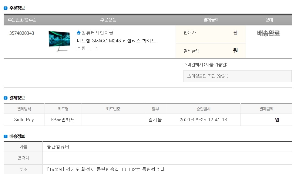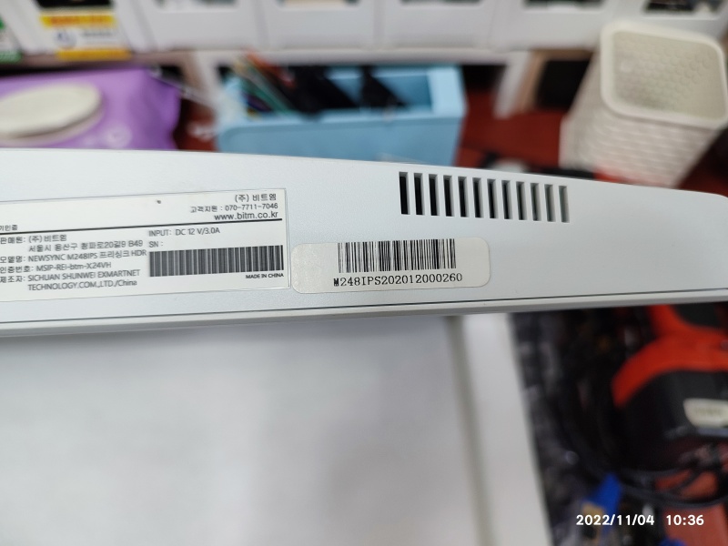 시리얼 넘버로 봤을 때는 2020년 12월 제품으로 추정됩니다. 비트엠 모니터 구매 내역을 확인해보니깐 2021년 8월 25일 경에 지마켓에서 구입했던 제품으로 보입니다. 주로 사용하는 메이커 외에는 거의 구입하지는 않는데, 이 당시(코로나 시국)에 모니터 액정 수급이 제대로 안돼서 시장에 24인치 모니터 재고가 없었던 시기인 거 같습니다. 그래서 재고로 두어대 구입했던 모양입니다.