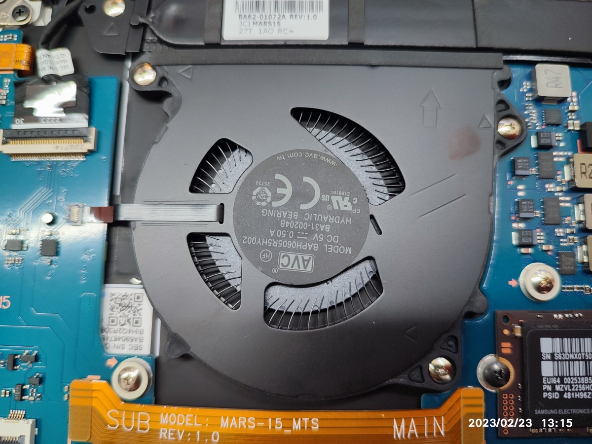 좌우측으로 모니터와 연결될 것으로 보이는 커넥터가 연결된 상태네요. 노트북에 사용된 팬의 모델명은 사진상으로 우측팬 = BAPH0605R5HY001 (BA31-00204A), 좌측팬 BAPH0605R5HY002 5V 0.50A BA31-00204B HYDRAULIC BEARING 제품이 장착된 상태네요. (동일한 팬 재고 없습니다. 팬 재고 문의 전화 X, 노트북 팬 재고 없어요. 참고하시라고 올리는 겁니다.)