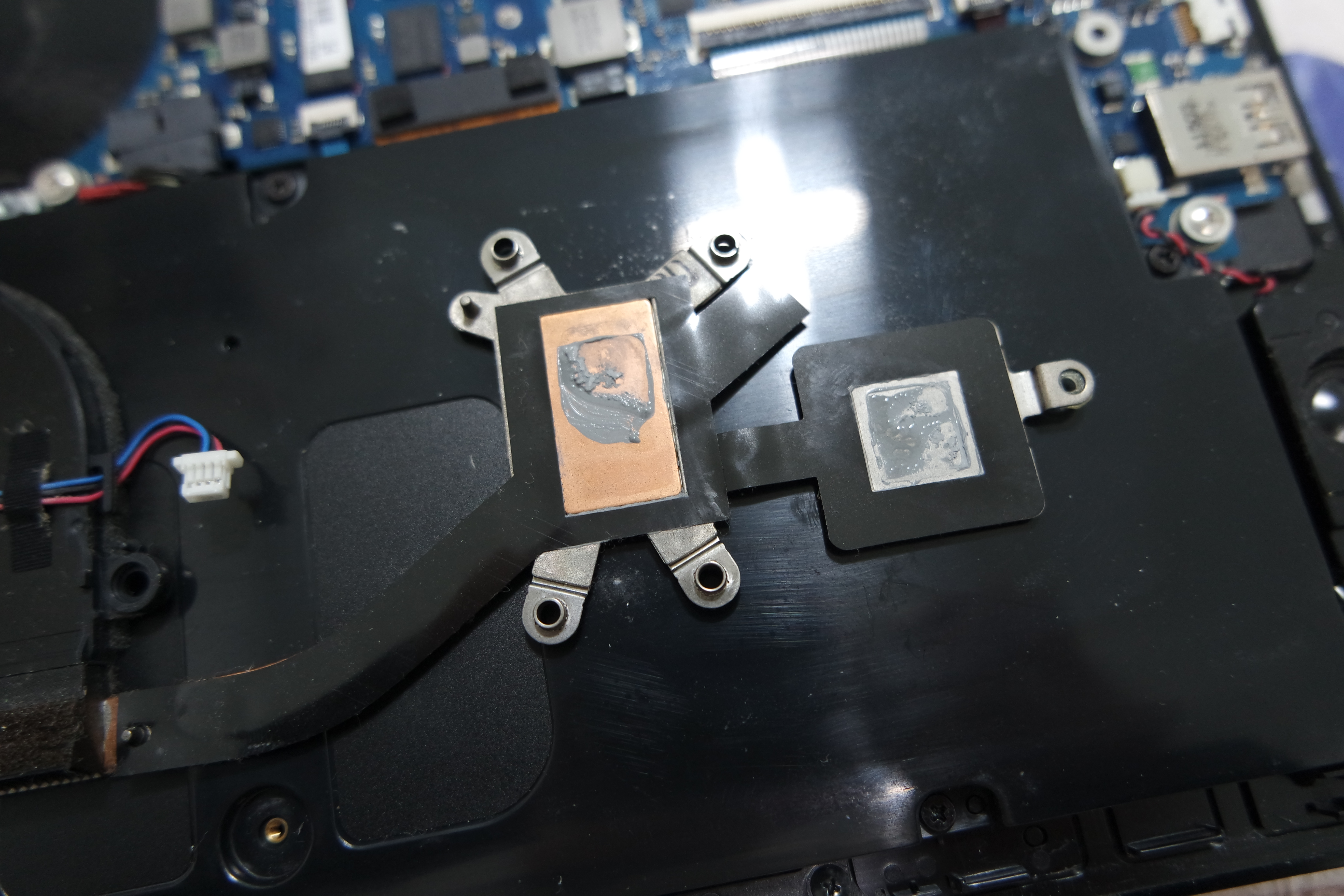 구리 방열판을 분리하면, 아래와 같이 서멀이 묻은 상태입니다.