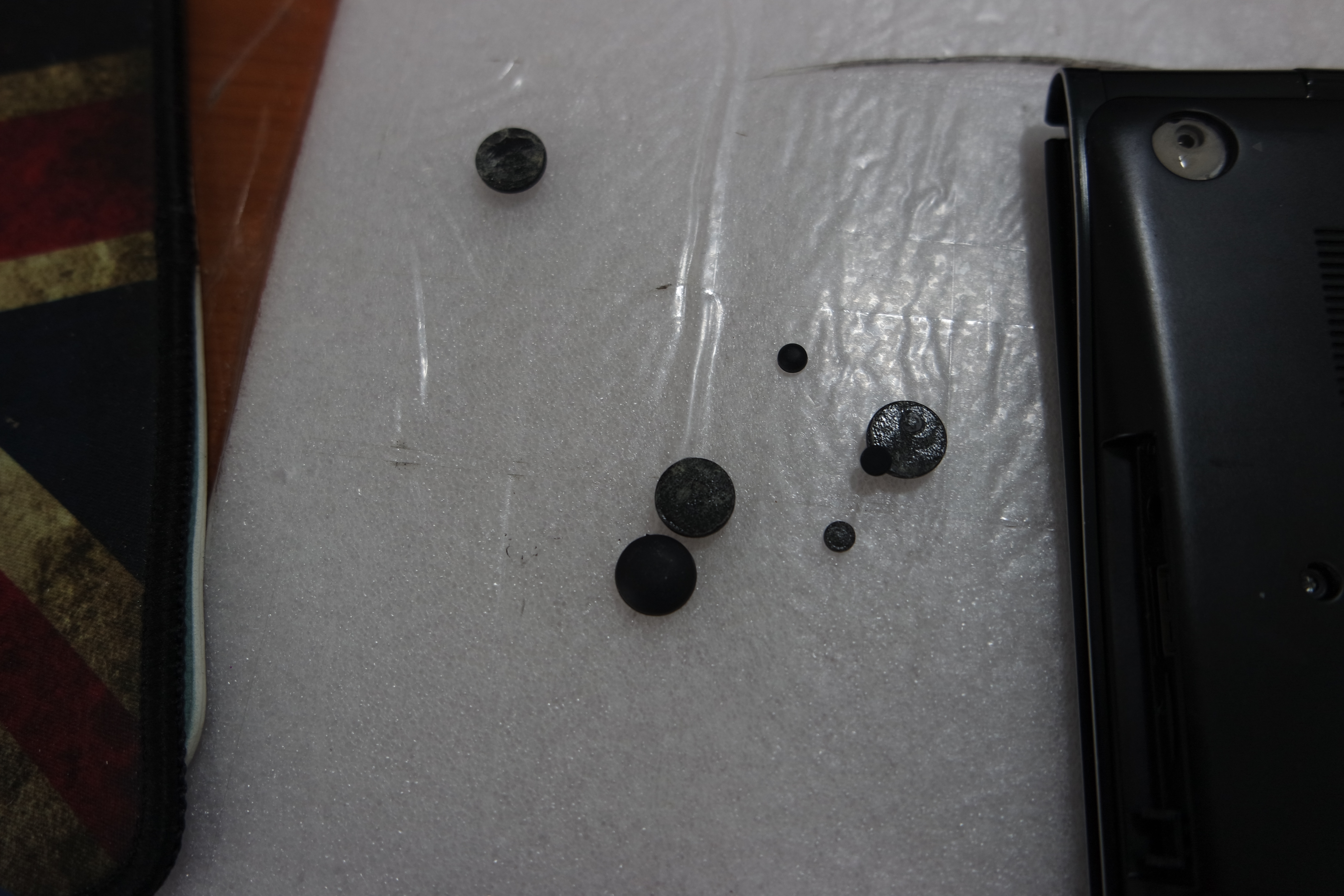 노트북 뒷면의 나사를 제거하기 위해서 미끄럼방지 마개를 제거했습니다.
