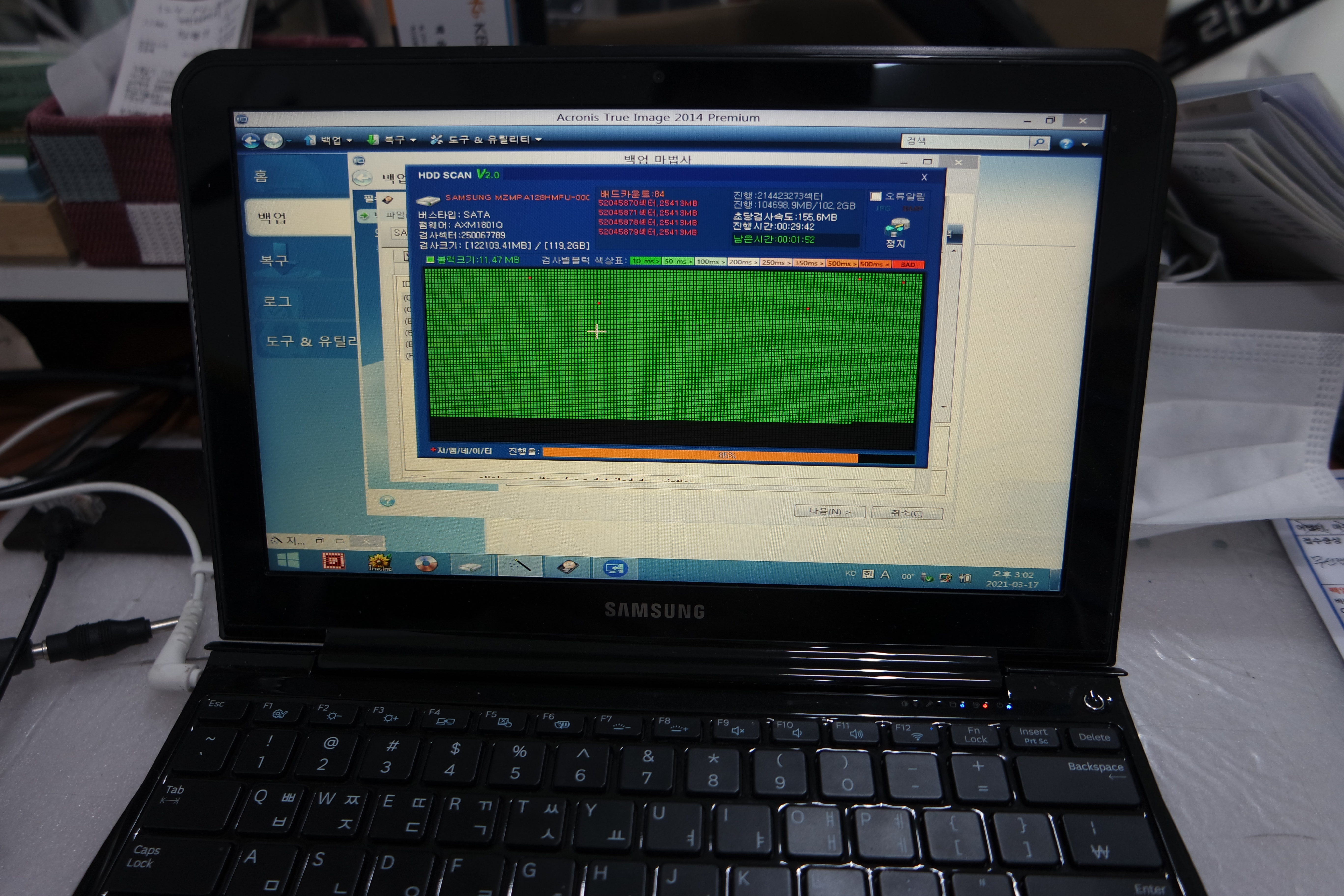아래의 사진은 이상이 있었던 120기가 제품의 하드디스크 표면 검사 결과입니다. SSD도 배드섹터(셀)가 많이 검출되고 있습니다. 배드섹터가 있으면, 다양한 증상이 생길 수 있습니다. 아래의 노트북은 무선랜이 안되는 증상을 호소하셨는데요. 저희 매장에서는 정상적으로 연결되기도 했습니다.