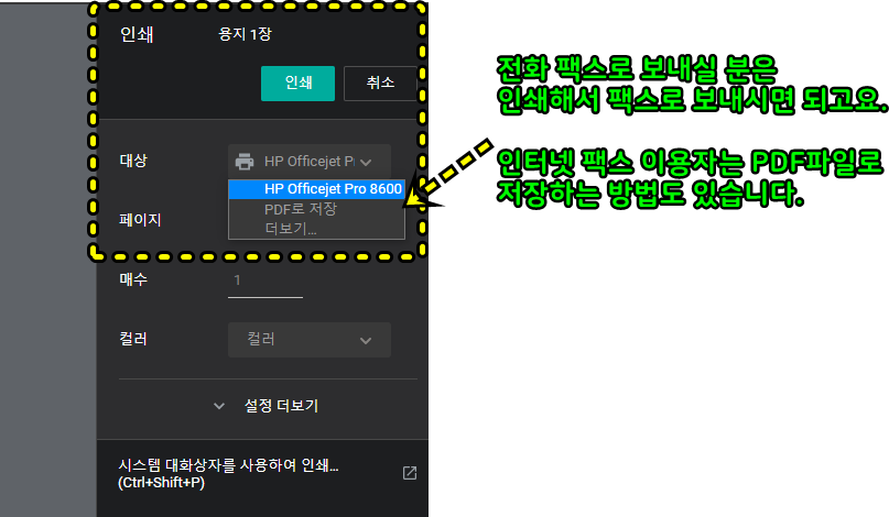 종이 인쇄말고 PDF 파일로 저장하는 방법도 있습니다.