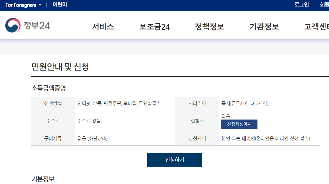 소득금액증명원은 정부24 사이트에서 열람 또는 출력할 수 있습니다.