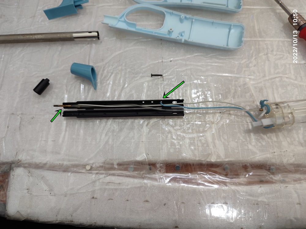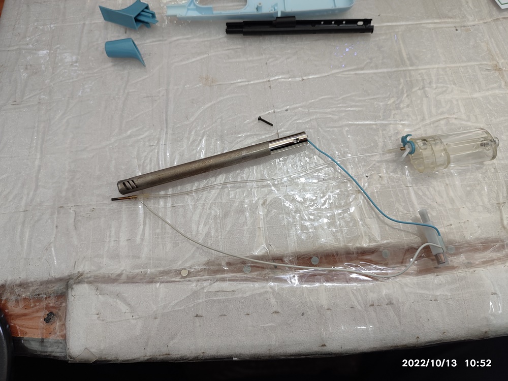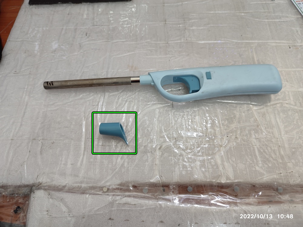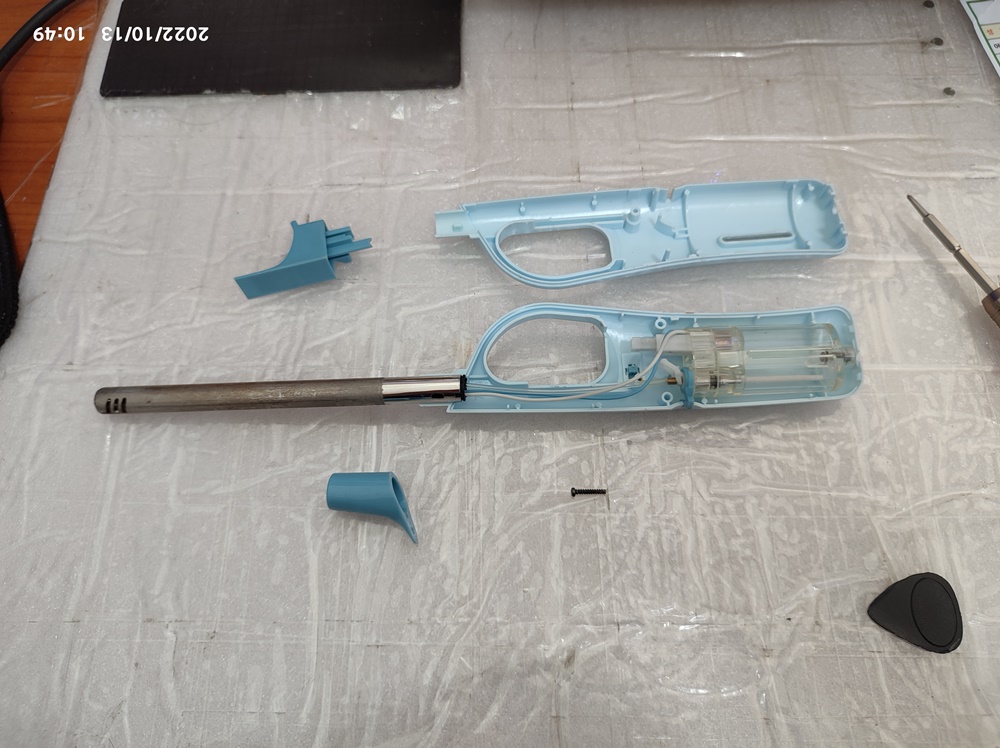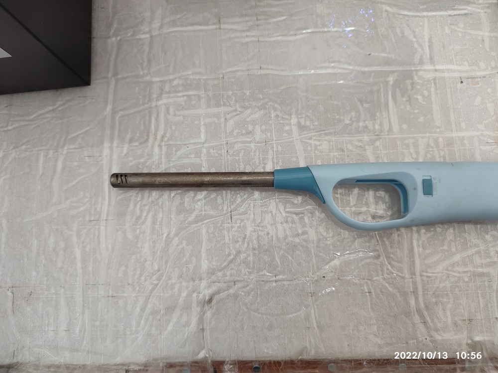 앞쪽에 스프링이 있고 하늘색 선과 흰색선이 두 갈래로 나눠져 있습니다. 스파크가 앞쪽에서 튀면서 불이 붙는 구조로 보입니다. 딱딱이라고 스파크를 일으킬 수 있는 손가락 한마디만한 제품과 가스통 구조로 만들어져 있습니다. 가스 분사량을 조절할 수 있는 레버가 보이네요. 레버를 위로 올려서 가스 분사량을 조절할 수 있을 듯 보입니다. (일반 라이터처럼)