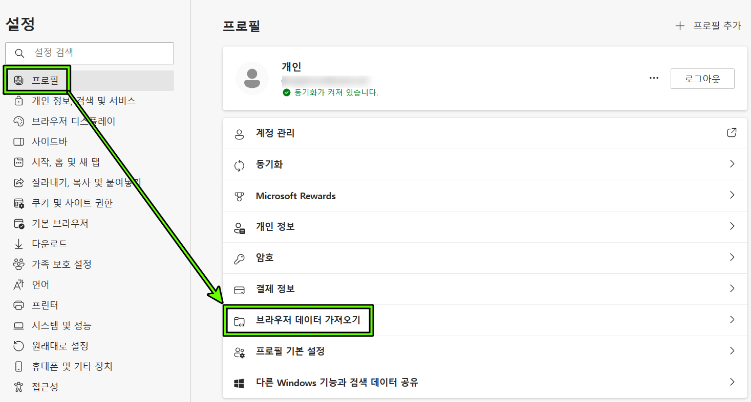 2. 프로필 - 브라우저 데이터 가져오기 클릭