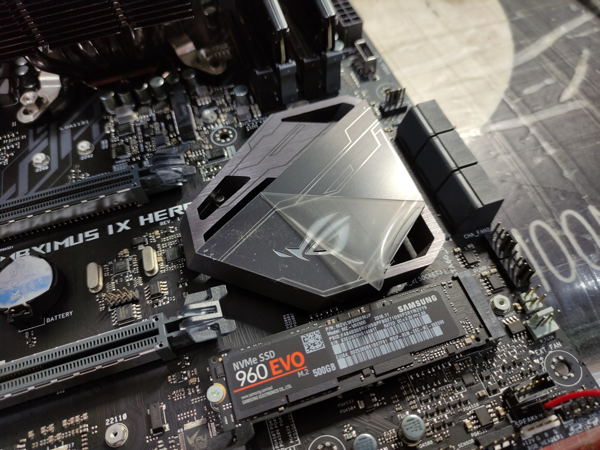 M.2 SSD가 기울어지지 않고 평평하게 장착됐습니다. 메인보드 칩셋 위의 비닐도 같이 제거했습니다. 발열에 좋지 않으니 스크래치 방지 비닐은 떼는 게 좋습니다. 용도는 유통과정에서 스크래치를 방지하기 위함입니다. 실사용자는 제거하는 게 좋습니다.