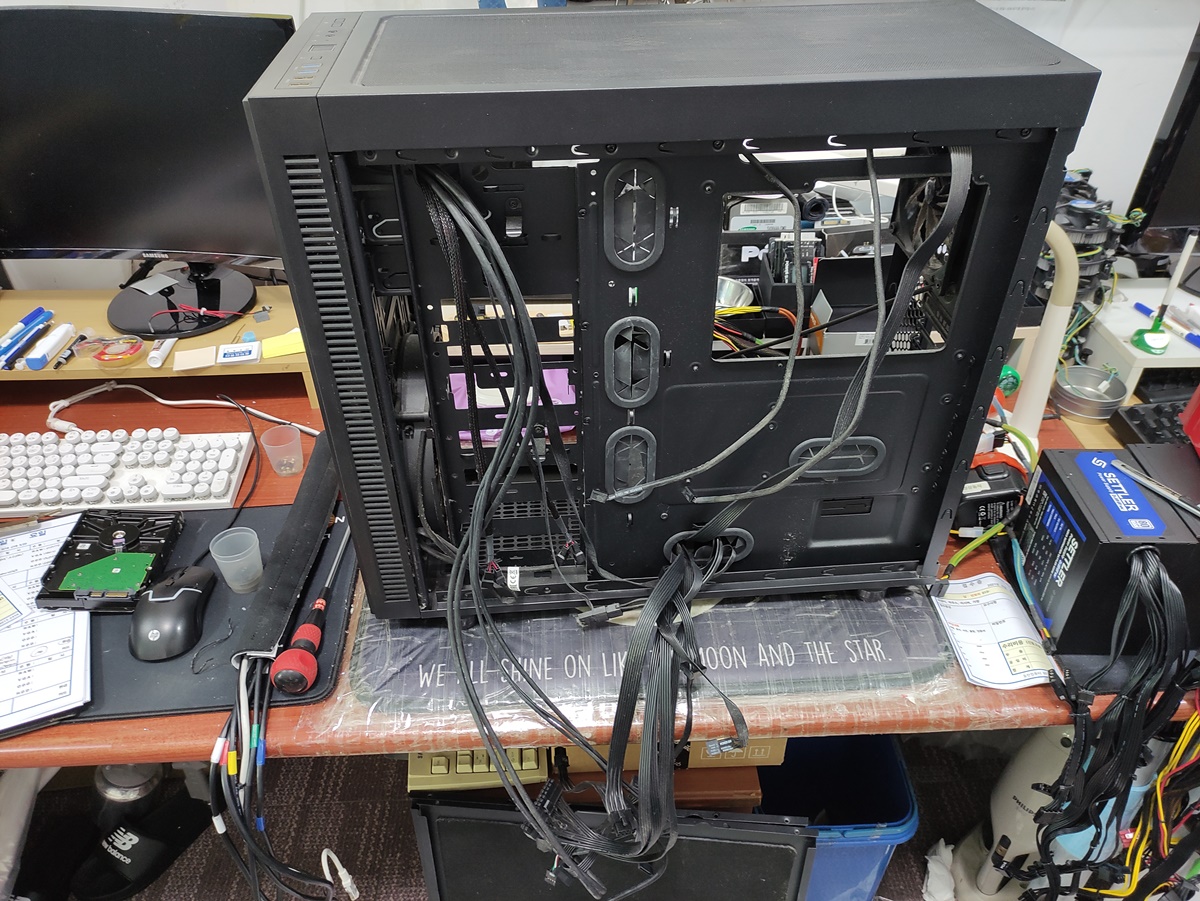 아래는 컴퓨터 청소를 의뢰하신 고객님의 컴퓨터입니다. 여름철 맞이 컴퓨터 청소와 서멀구리스 재도포 작업을 같이 진행하셨습니다. 아래의 컴퓨터는 개인적으로 서멀 컴파운드 재도포하기가 까다롭은 본체입니다. 사제 쿨러가 장착된 경우라서 그렇습니다. 쿨러 고정 나사가 메인보드 뒷면에 있어서 케이스를 뒤집어서 쿨러를 해제하고 다시 재도포하는 방법도 있지만, 선정리 및 먼지 청소도 같이 진행할 예정이라서 메인보드를 컴퓨터 케이스에서 분리한 상태로 작업을 진행했습니다.