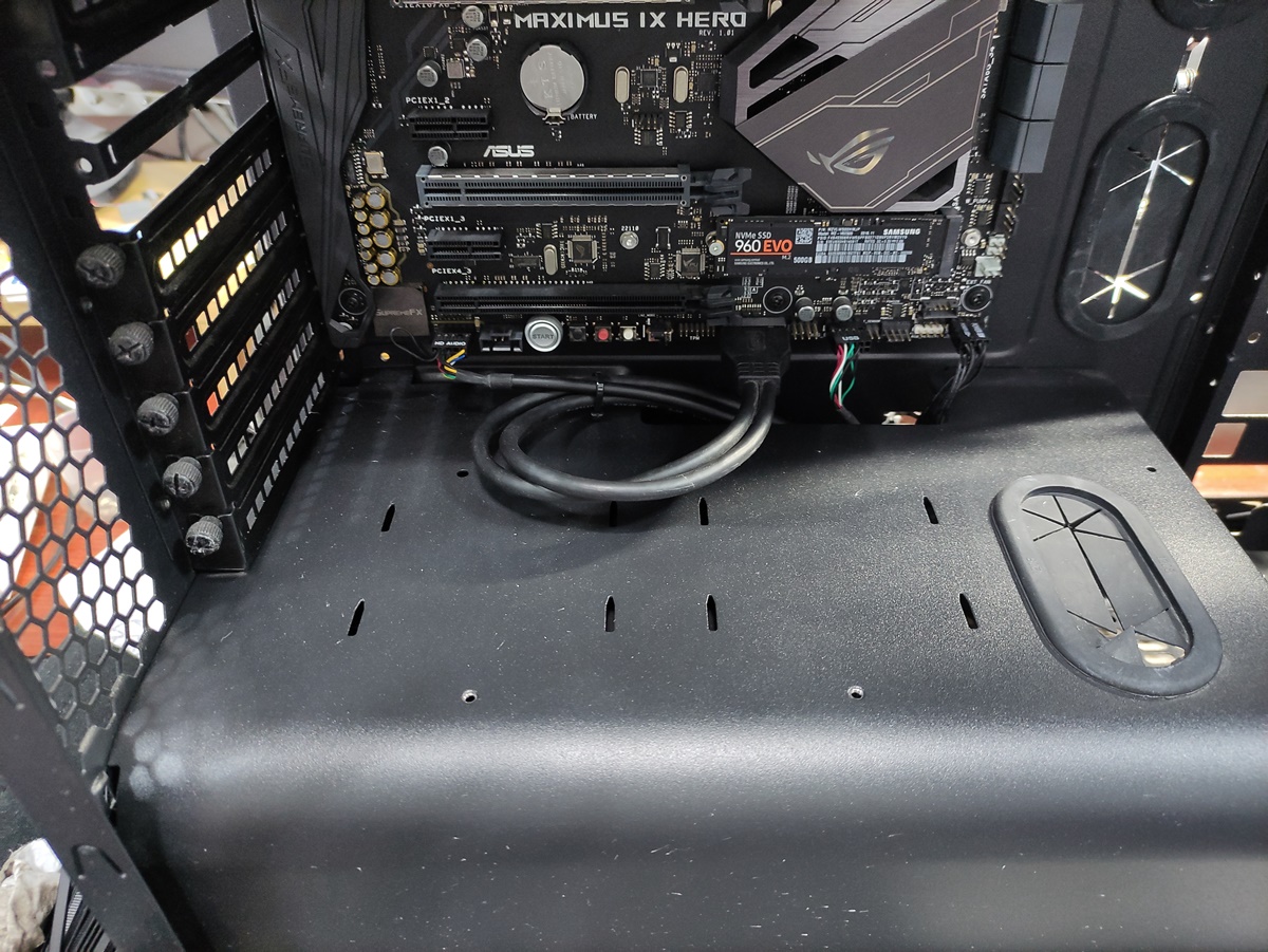 The header of the USB 3.0 extension cable in front of the case is hard, so I can only organize it like this. It is not in the picture, but I installed a support to secure the cable tie underneath the cable and fixed it further with the cable tie.