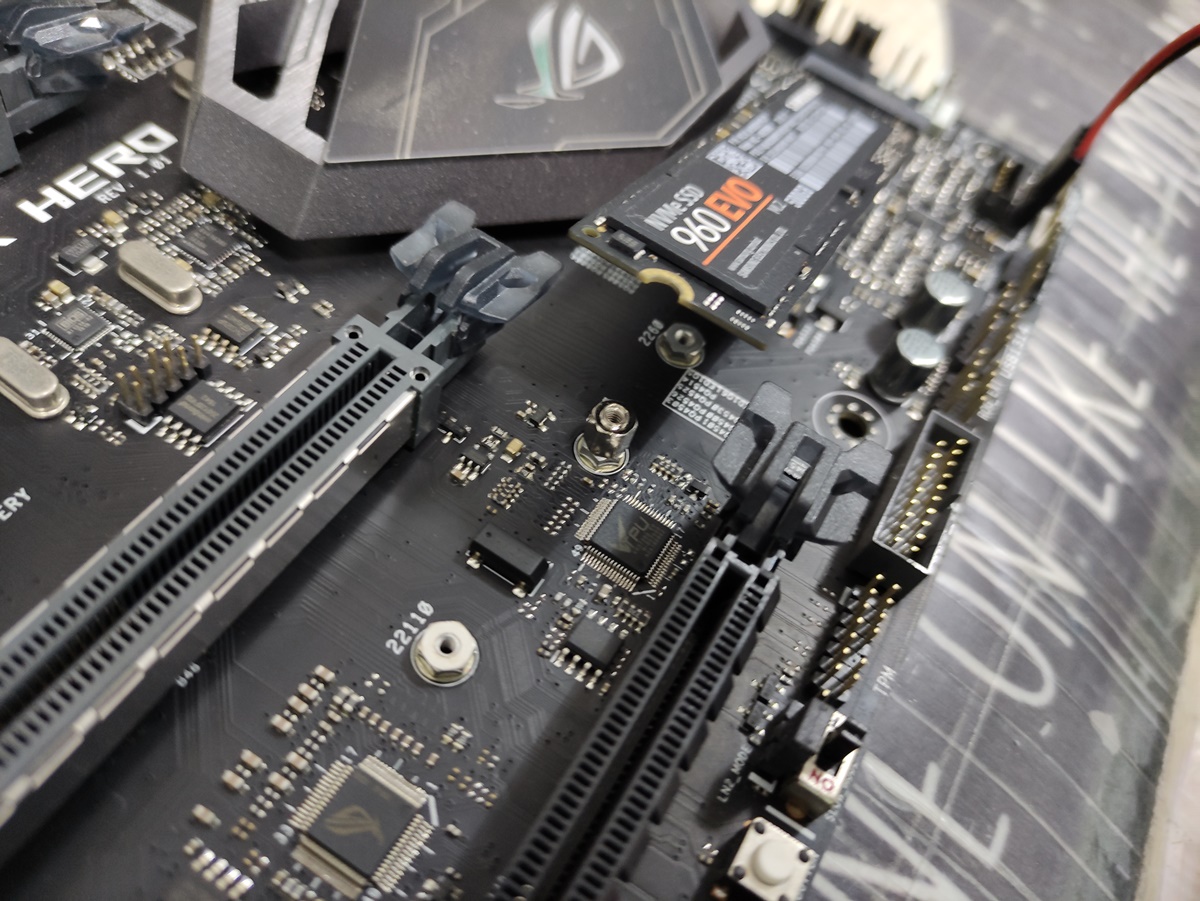 M.2 SSD 밑에 받침대를 설치하고 M.2 SSD를 고정하고 있습니다.