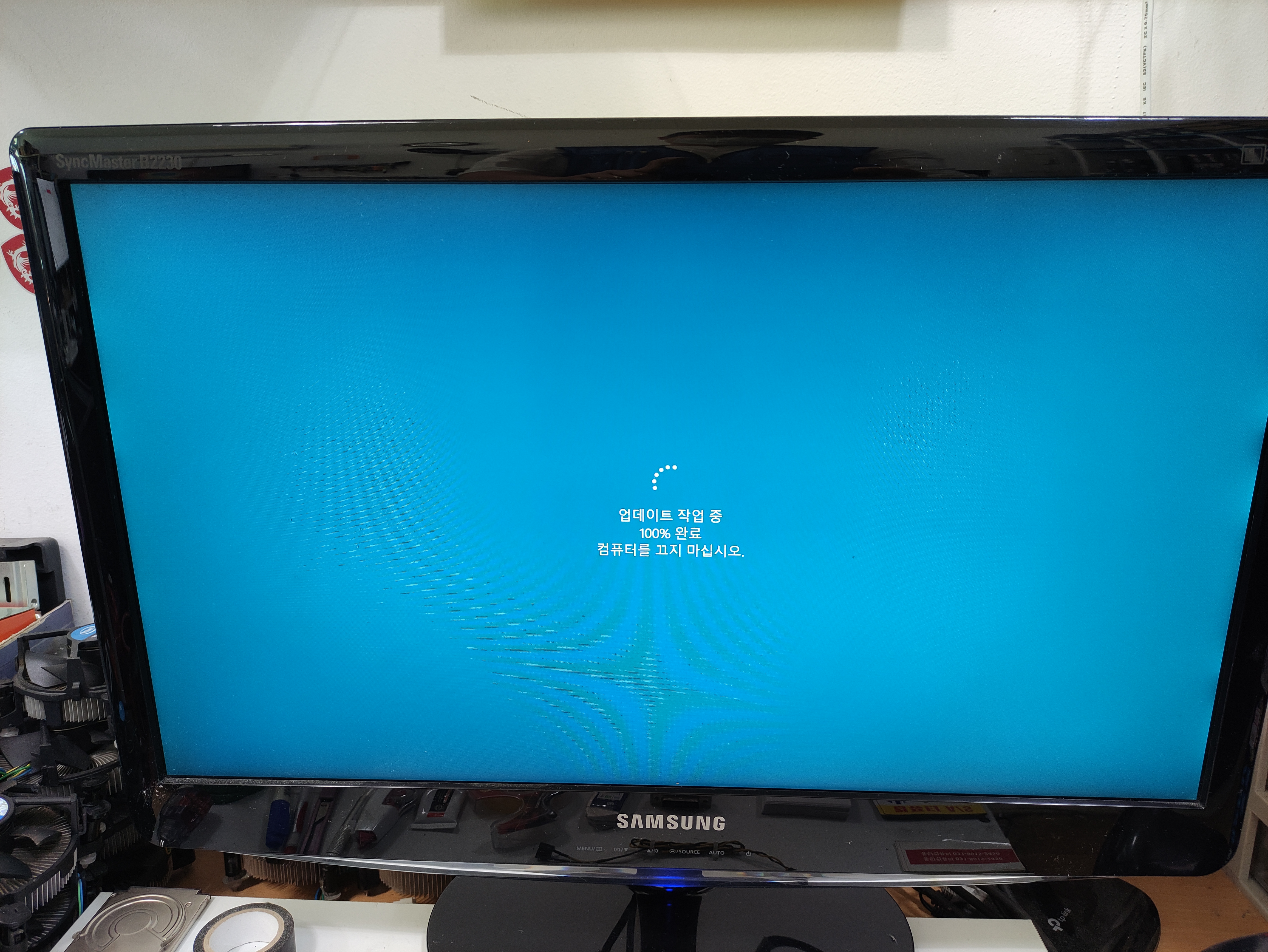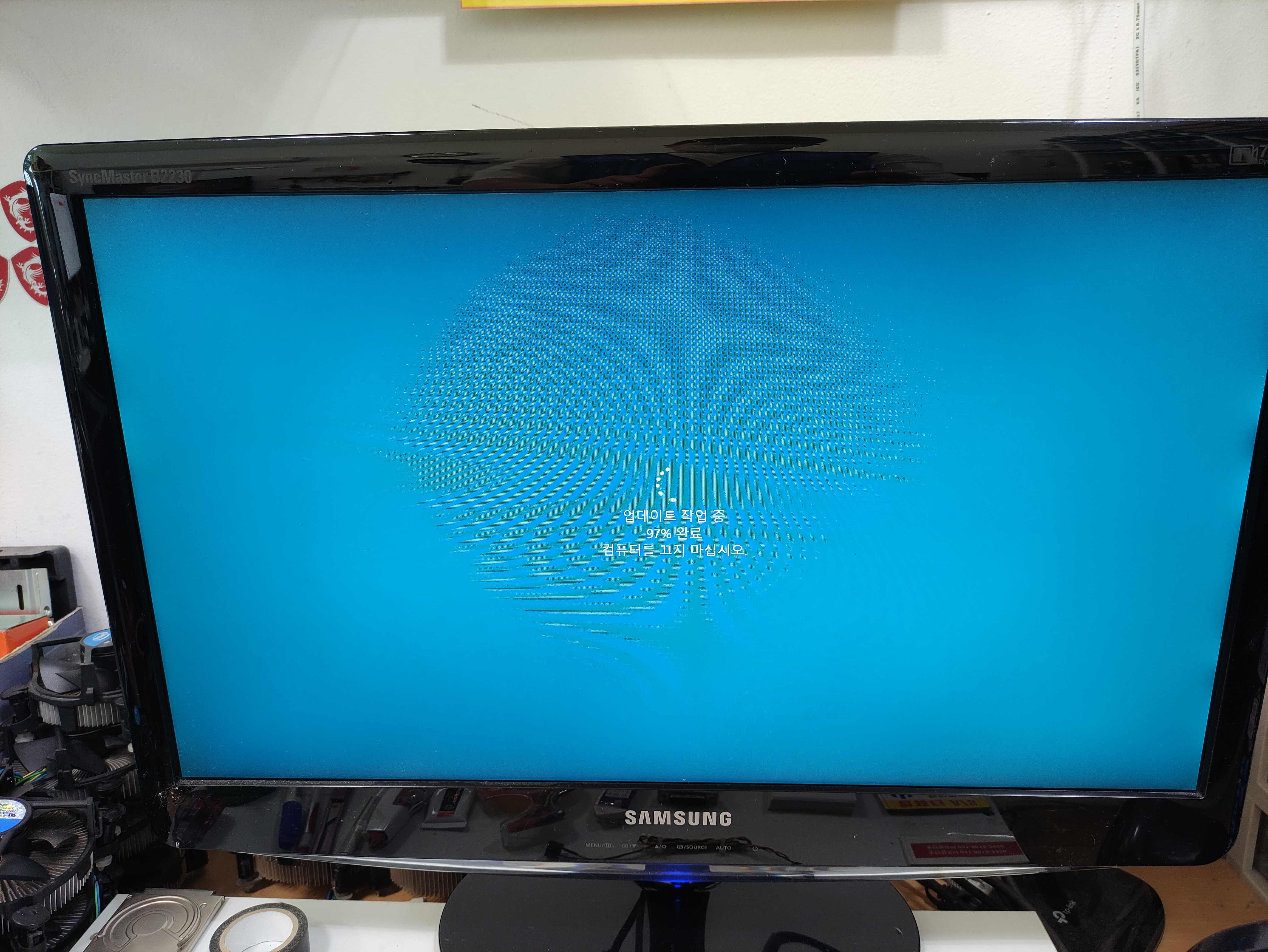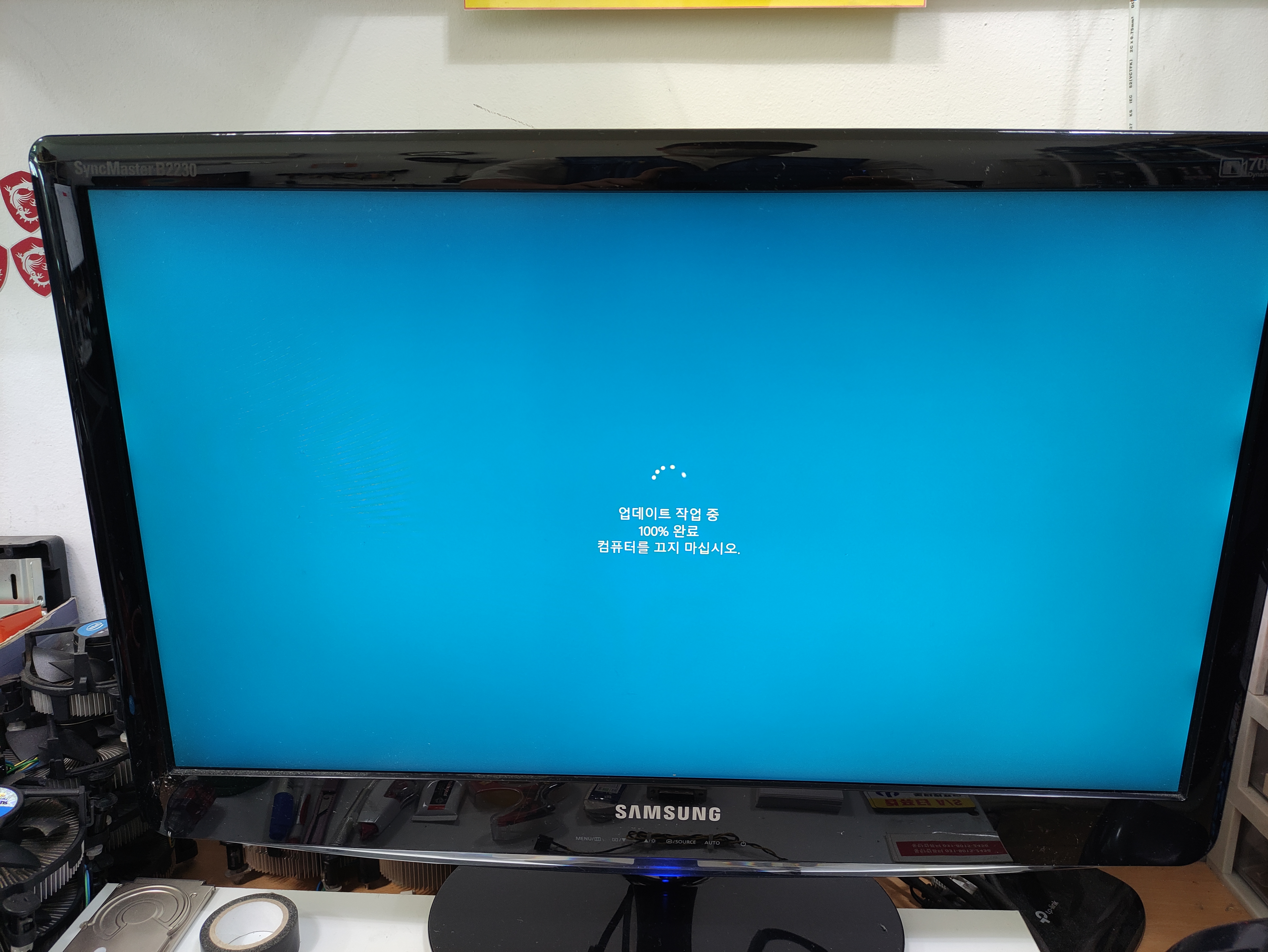 윈도우 업데이트가 진행되고 있는건지? 30% 45% 50% 60% 등 다양한 퍼센테이지에서 넘어가지고 않고 멈춰있는 것 처럼 보이는 경우가 있는데요. 하루 종일 켜놨는데도 업데이트진행이 안되는 것이라서 컴퓨터에 무슨 문제가 생긴 것이기 때문에, 점검을 받아봐야하는 경우이고요. 보통은 한시간 이내에 업데이트가 완료되는 경우가 많습니다. 최신 컴퓨터이고 사양이 괜찮은 컴퓨터라면, 10~30분 이내에 거의 완료됩니다. 윈도우 업데이트가 한참 진행되고 있는데 컴퓨터를 종료하면, 윈도우 시스템 손상으로 부팅이 안되거나 부팅이 되더라도 정상적으로 동작하지 않는 경우가 생길 가능성이 큽니다. 기다림이 힘들더라도 최대한 기다려 보시는 걸 권장드립니다. 아래의 컴퓨터도 업데이트가 상당히 오래 걸리는 컴퓨터가 입고됐는데요. 손님께서 옆에서 기다리고 계신 경우에는 저도 마음이 급합니다. 옆에 안 기다리시면, 제 할 일하다보면, 자동으로 업데이트가 완료되어 있는 경우가 많습니다.