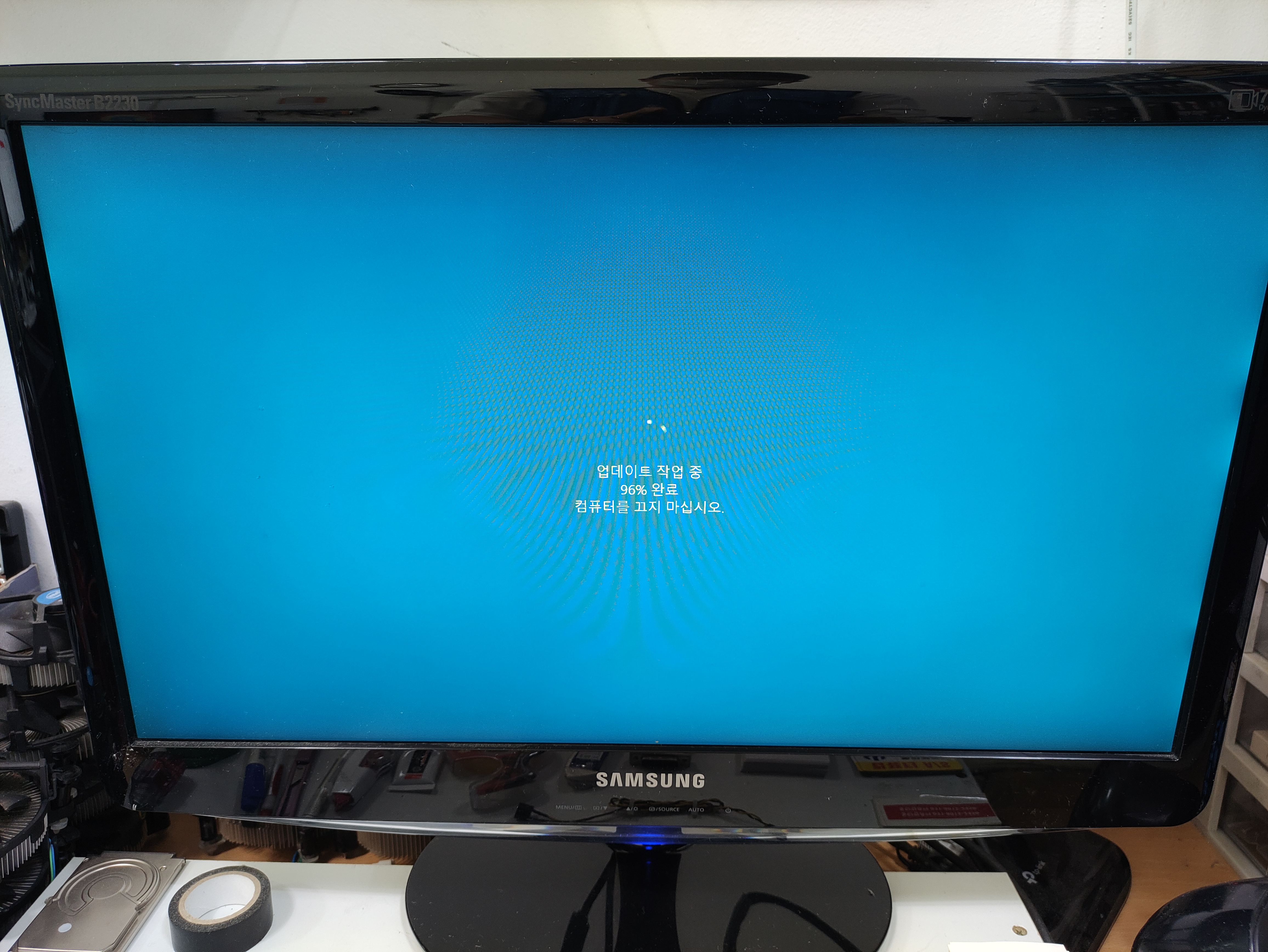 윈도우 업데이트가 진행되고 있는건지? 30% 45% 50% 60% 등 다양한 퍼센테이지에서 넘어가지고 않고 멈춰있는 것 처럼 보이는 경우가 있는데요. 하루 종일 켜놨는데도 업데이트진행이 안되는 것이라서 컴퓨터에 무슨 문제가 생긴 것이기 때문에, 점검을 받아봐야하는 경우이고요. 보통은 한시간 이내에 업데이트가 완료되는 경우가 많습니다. 최신 컴퓨터이고 사양이 괜찮은 컴퓨터라면, 10~30분 이내에 거의 완료됩니다. 윈도우 업데이트가 한참 진행되고 있는데 컴퓨터를 종료하면, 윈도우 시스템 손상으로 부팅이 안되거나 부팅이 되더라도 정상적으로 동작하지 않는 경우가 생길 가능성이 큽니다. 기다림이 힘들더라도 최대한 기다려 보시는 걸 권장드립니다. 아래의 컴퓨터도 업데이트가 상당히 오래 걸리는 컴퓨터가 입고됐는데요. 손님께서 옆에서 기다리고 계신 경우에는 저도 마음이 급합니다. 옆에 안 기다리시면, 제 할 일하다보면, 자동으로 업데이트가 완료되어 있는 경우가 많습니다.