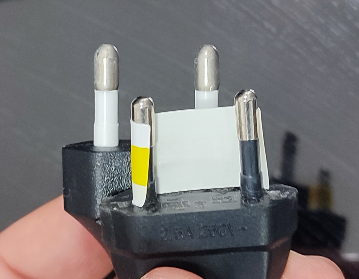 한국 규격의 2구 전원 선 (밑), 비슷하게 생겼지만, 외국에서 사용하는 2구 플러그입니다. 국내 규격보다 얇은 제품이 있습니다. 얇은 제품을 국내에서 사용하면, 꽂을 때 스파크가 튄다든지 사용 중에 잘 꺼진다든지 접속이 좋지 않습니다. 국내 콘센트 규격에 맞는 제품을 사용하는 게 좋습니다. 심지어, 멀티탭도 오래 사용하면, 콘센트가 헐거워진 경우에 접속 불량 문제가 발생할 수 있습니다.