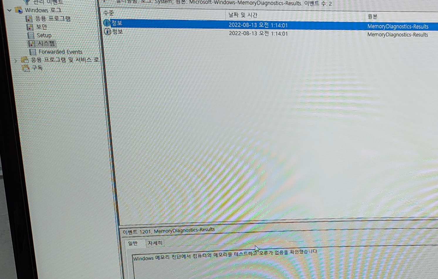 손님 메인보드에 장착해서, 추가적인 테스트를 진행합니다. 아래의 테스트는 윈도우10에 내장된 메모리 진단 도구 프로그램을 이용해서, 테스트를 진행하고 있습니다. 별다른 문제가 없이 통과됐습니다. 윈도우 로그에서 시스템 항목에서 메모리 진단 결과를 필터링해서 확인해보면, 오류가 없었다고 표기가 됩니다.