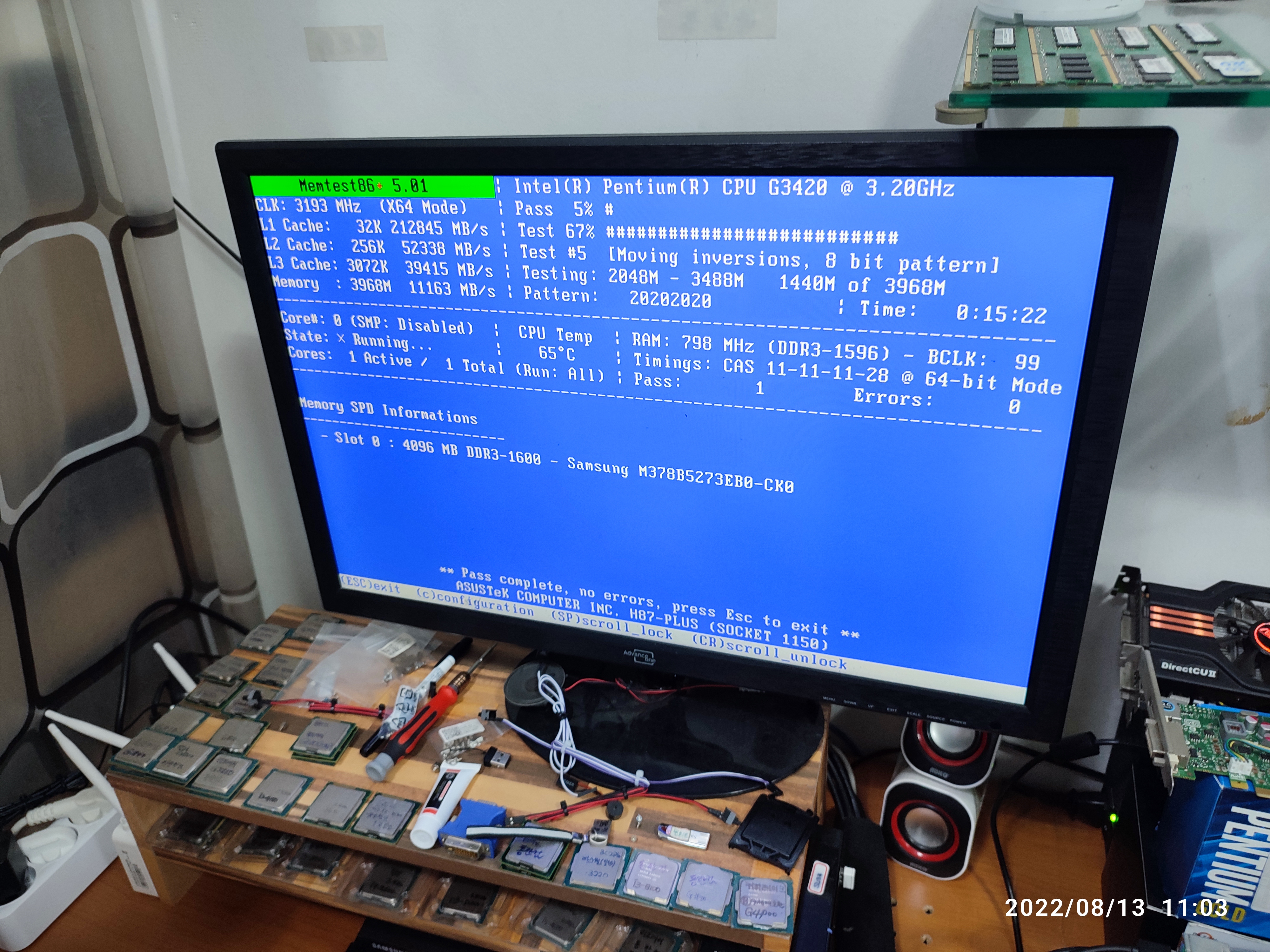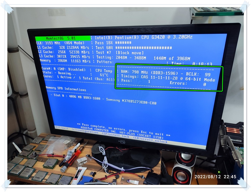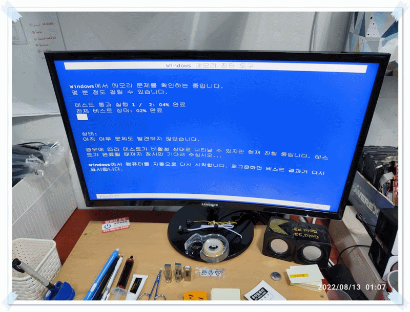 아이러니한 경우가 아닐 수 없는데요. 손님의 메인보드에 메모리를 장착해서 검사하면, 아래와 같이 정상적으로 통과된 걸 확인할 수 있습니다. 이중으로 불량 체크가 된다면, 메모리의 불량으로 단정하고 제거할 수 있지만, 한 쪽에서는 정상 판별이 된다면, 불량으로 진단내리기가 참 쉽지는 않습니다. (A/S 센터에서 정상 동작해서, 다시 받았는데, 내 컴퓨터에는 계속 오류가 발생하는 경우처럼, 누구의 잘못이라고 딱 잘라 말하기가 어려운 경우입니다. 보통은 부속 간의 궁합 - 접속의 문제도 있을 수 있기 때문에, 딱 끊어서 원인 찾기가 어려운 경우입니다. 센터에도 자신의 상황을 설명하고 같은 제품으로 맞교체를 받아보실 거 같습니다.)