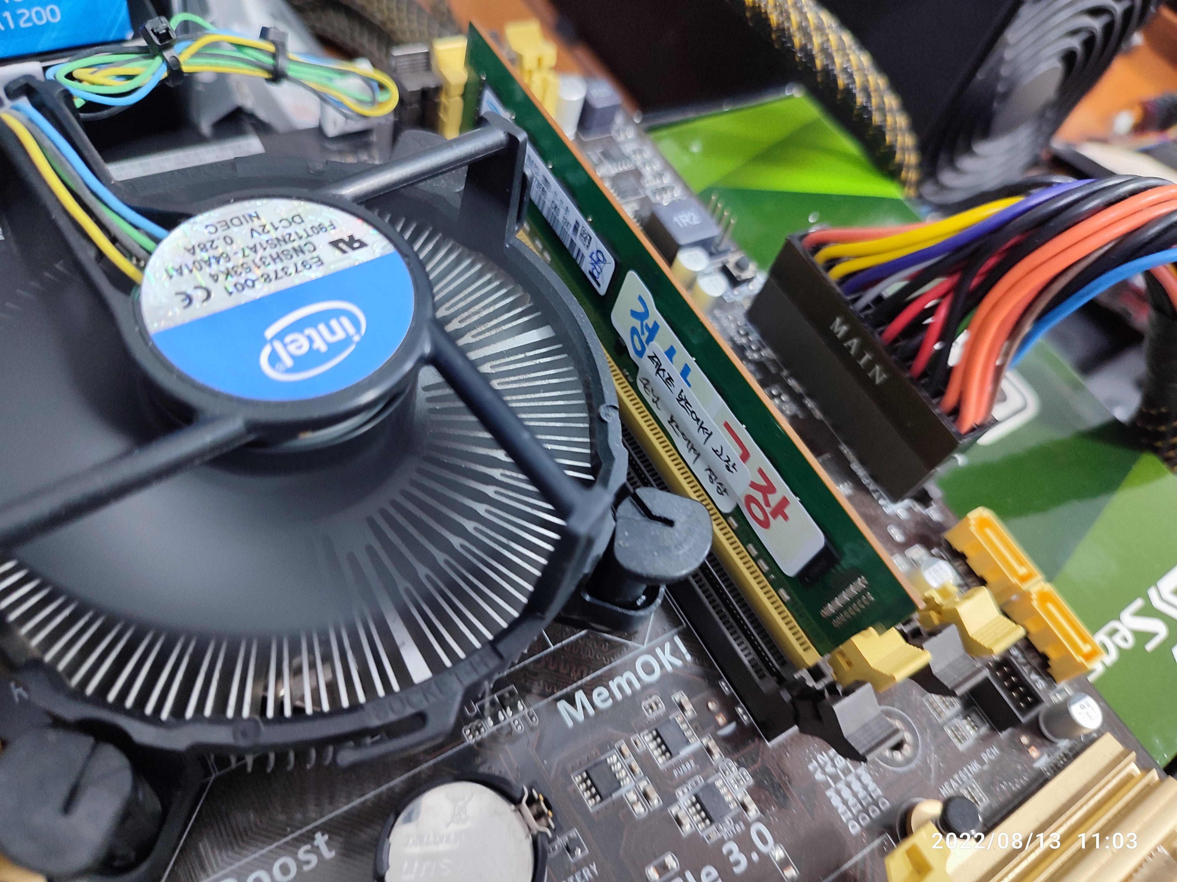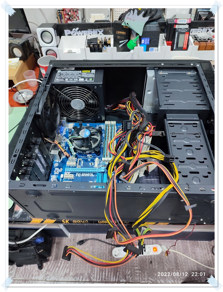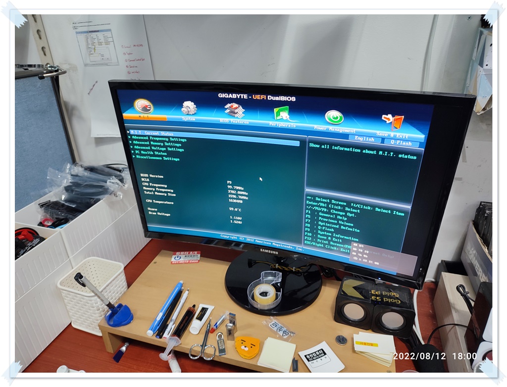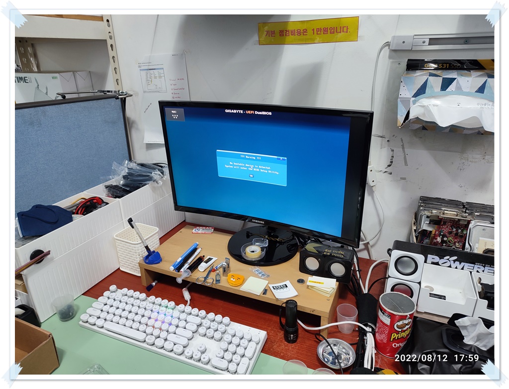 아래는 제 테스트용 메인보드입니다. 제 CPU와 메모리, 파워서플라이 등으로 테스트해서 잘 되는 걸 확인하고 분류해둔 테스트용 메인보드입니다. 손님의 CPU와 메모리, 그래픽카드 등의 호환성이 있는 메인보드입니다. 일단은 제 부품을 다시 연결해서, 메인보드가 정상적으로 동작하는지, 손님 부품을 장착하기 전에 제 메인보드의 상태를 다시 확인합니다. 테스트하고 보관하고 있었을 뿐인데도, 세월이 지나면, 갑작스럽게 동작을 멈추는 (고장나는) 보드도 있기 때문에, 손님 부속을 테스트하기전에 먼저 상태 점검해보고 교차 테스트 진행합니다. 손님과 같이 확인한다고 테스트 과정은 사진상으로 남기진 못했네요. 제 보드는 정상적으로 바이오스 화면까지 진입됩니다. (윈도우 화면까지는 넘어가지 않았습니다. 그렇게 확인하는 게 더 정확하지만, 시간이 오래 걸립니다.)