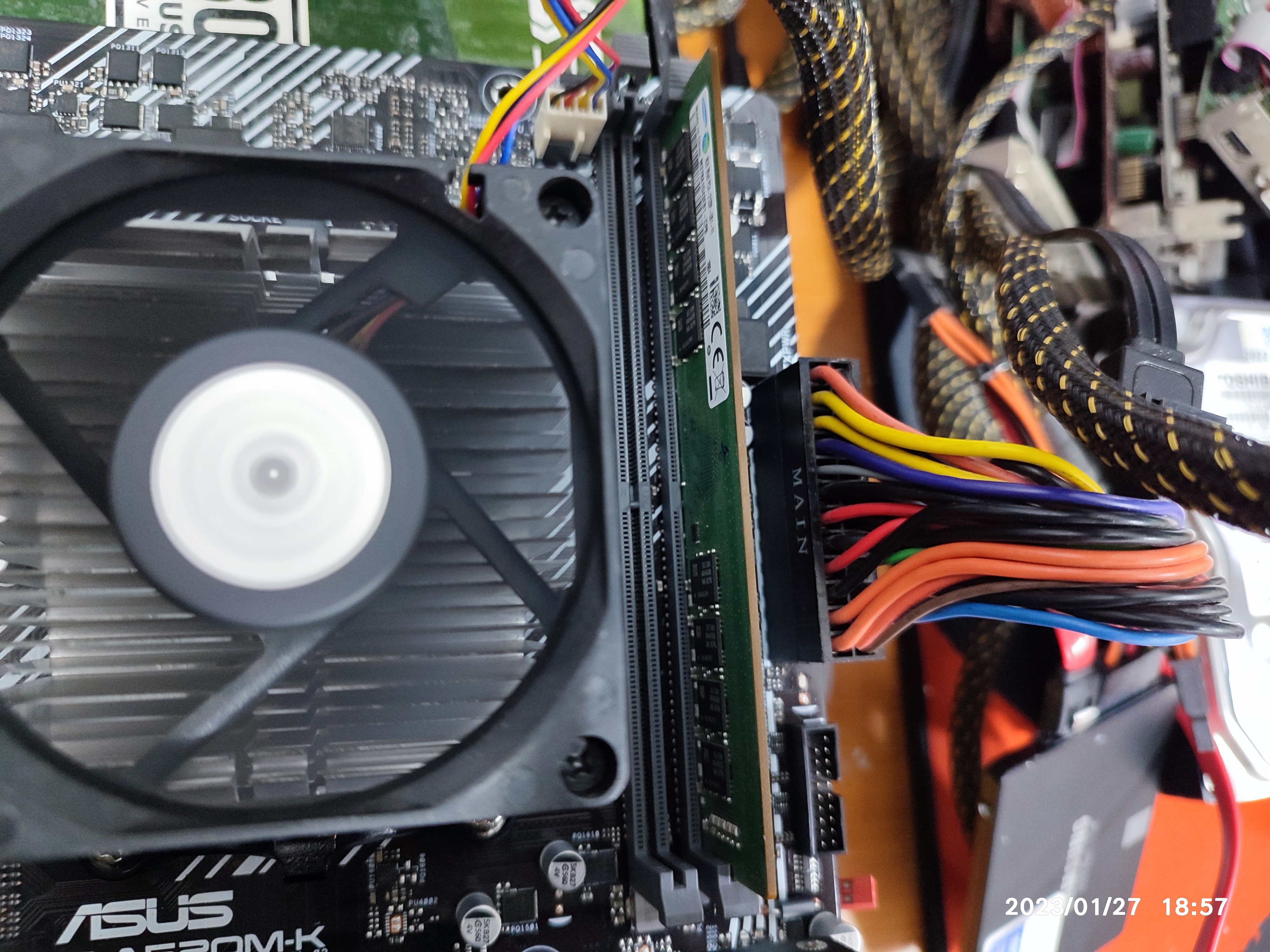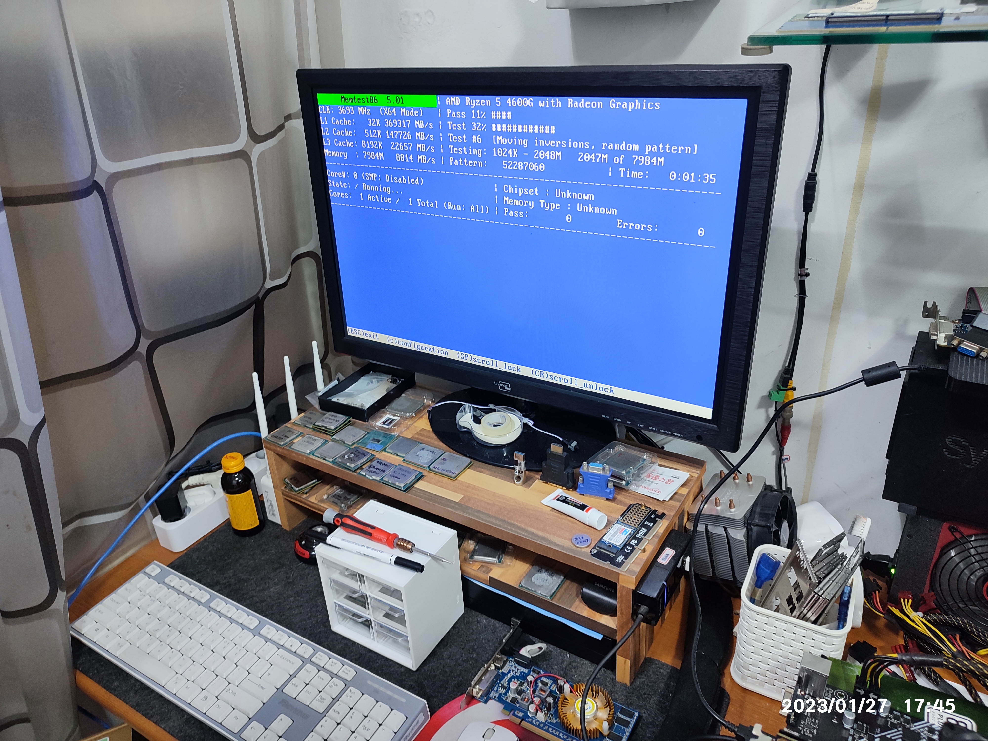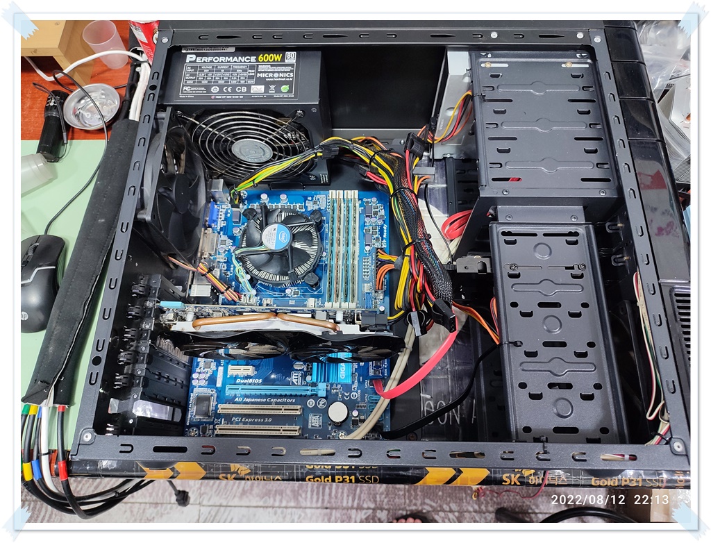 아래는 제 테스트용 메인보드입니다. 제 CPU와 메모리, 파워서플라이 등으로 테스트해서 잘 되는 걸 확인하고 분류해둔 테스트용 메인보드입니다. 손님의 CPU와 메모리, 그래픽카드 등의 호환성이 있는 메인보드입니다. 일단은 제 부품을 다시 연결해서, 메인보드가 정상적으로 동작하는지, 손님 부품을 장착하기 전에 제 메인보드의 상태를 다시 확인합니다. 테스트하고 보관하고 있었을 뿐인데도, 세월이 지나면, 갑작스럽게 동작을 멈추는 (고장나는) 보드도 있기 때문에, 손님 부속을 테스트하기전에 먼저 상태 점검해보고 교차 테스트 진행합니다. 손님과 같이 확인한다고 테스트 과정은 사진상으로 남기진 못했네요. 제 보드는 정상적으로 바이오스 화면까지 진입됩니다. (윈도우 화면까지는 넘어가지 않았습니다. 그렇게 확인하는 게 더 정확하지만, 시간이 오래 걸립니다.)